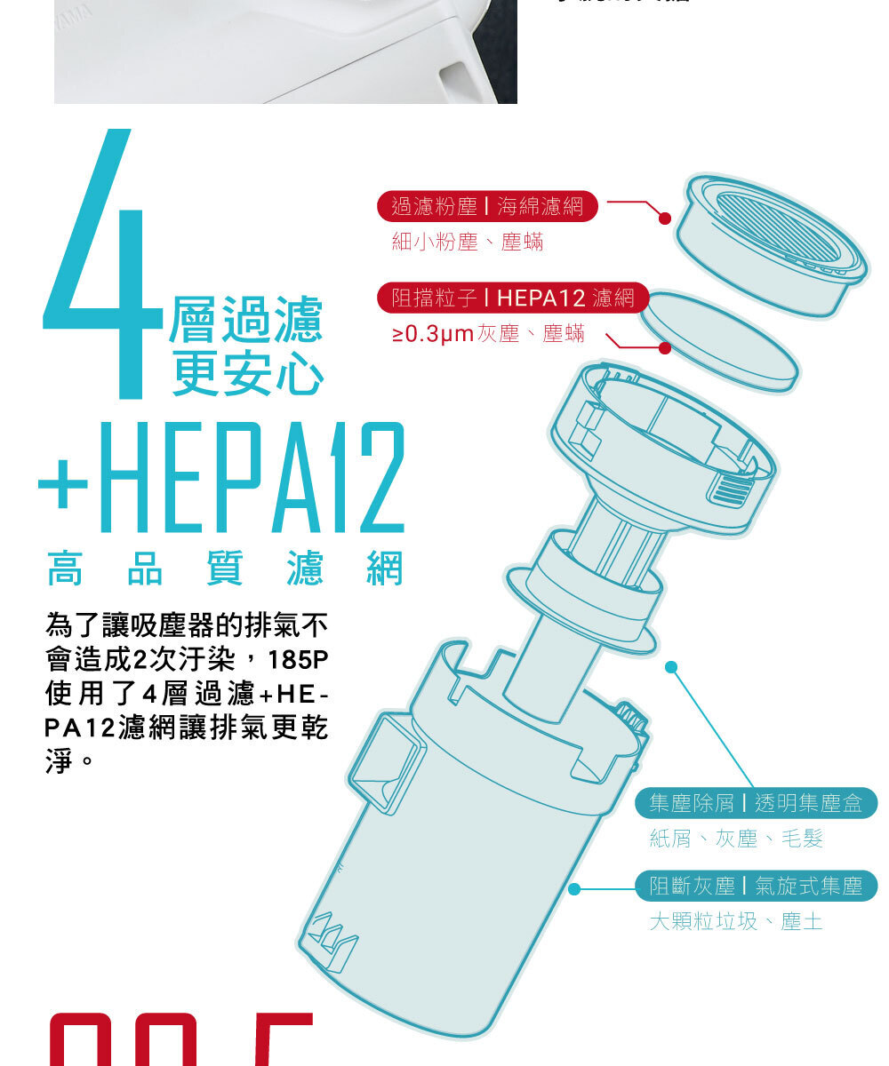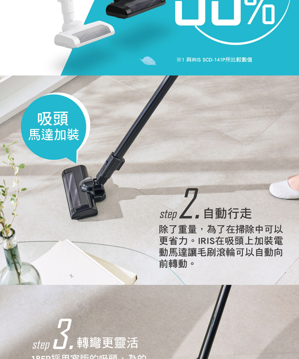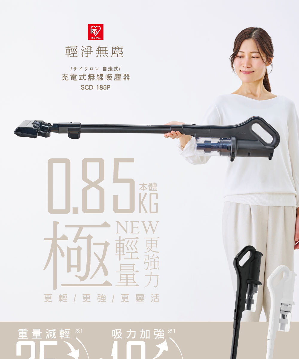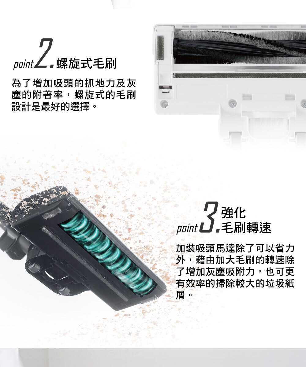 • 極輕量0.85公斤(本體)搭配電動吸頭,讓打掃變得更輕盈