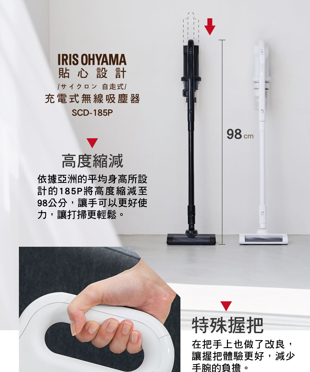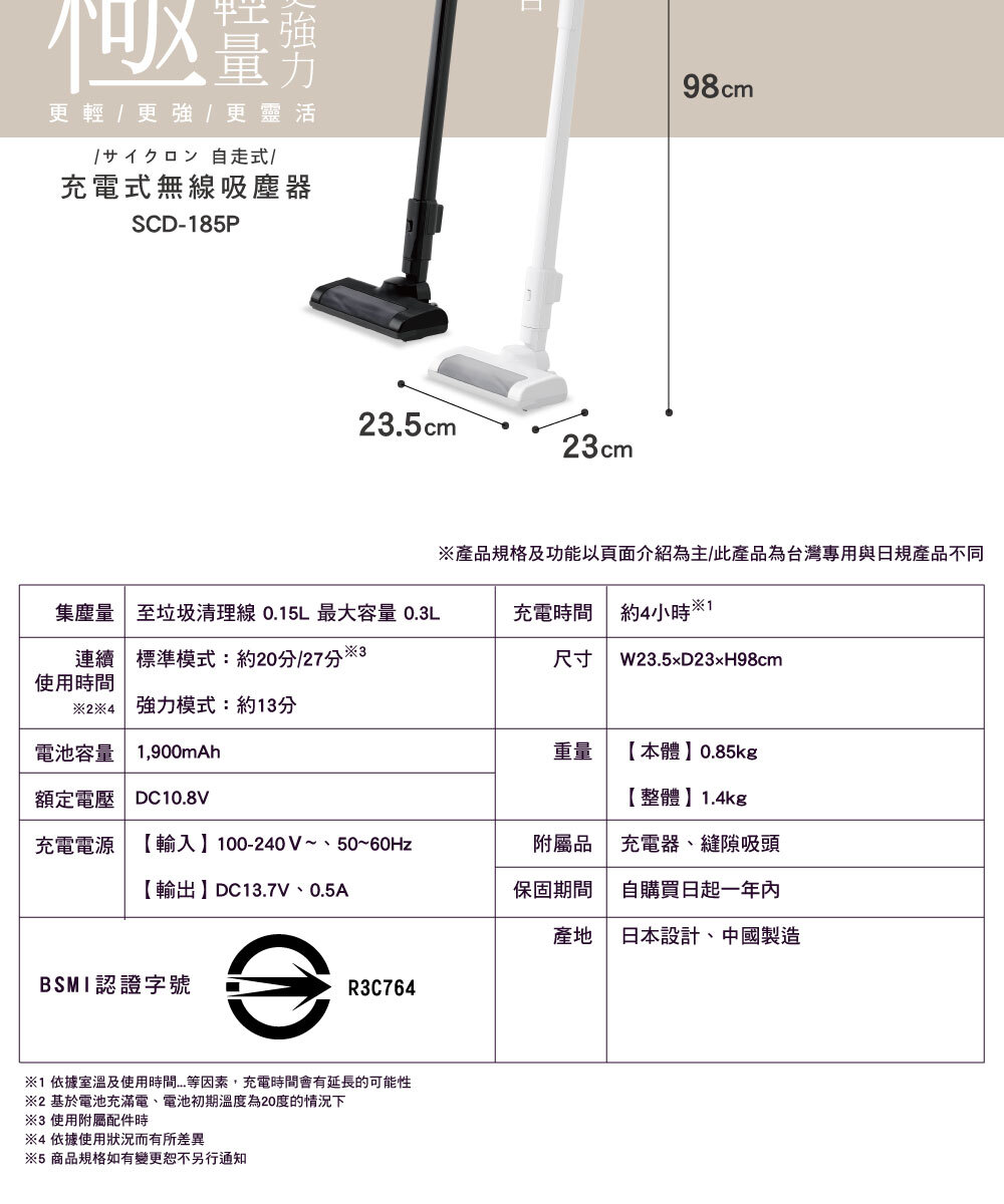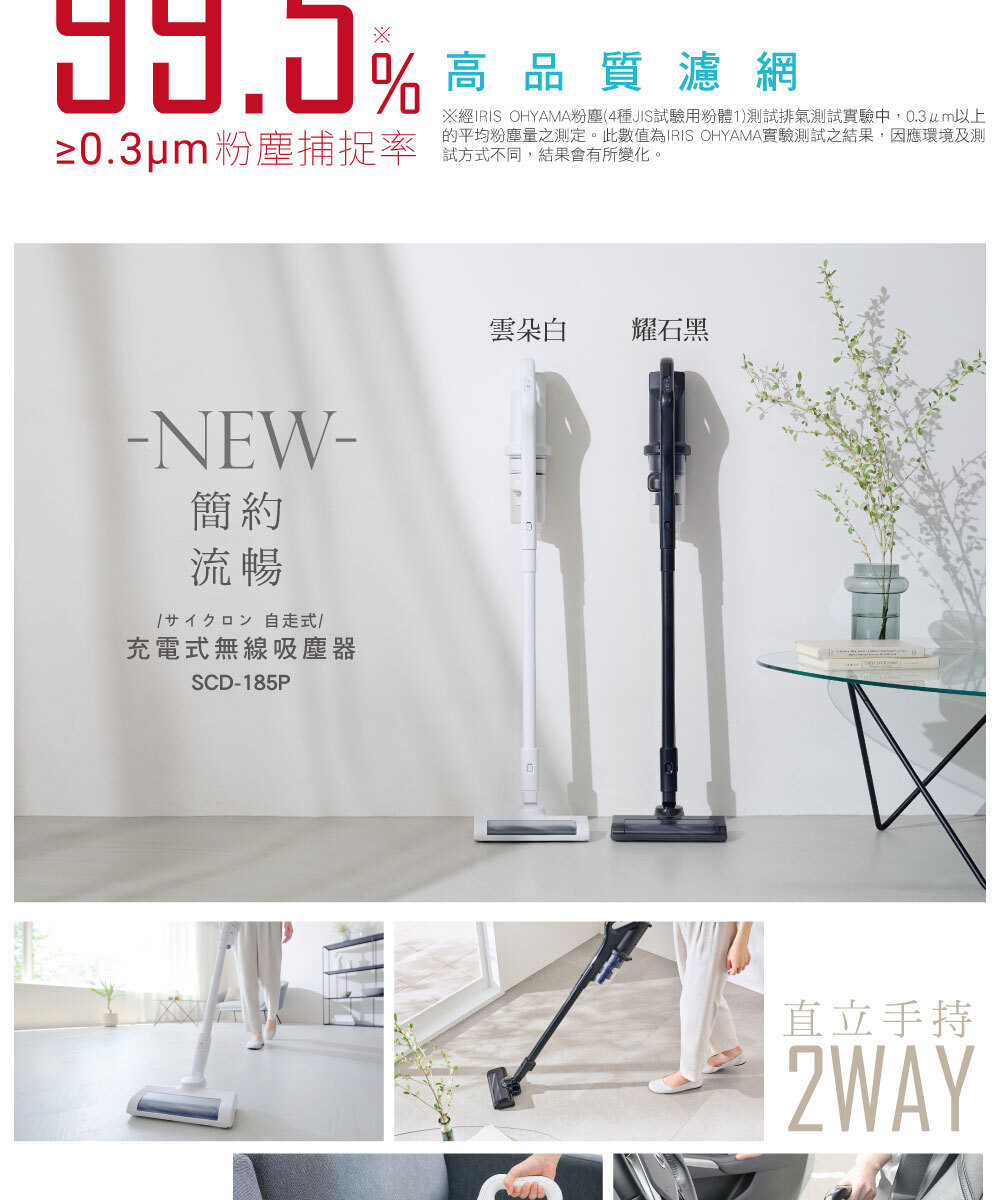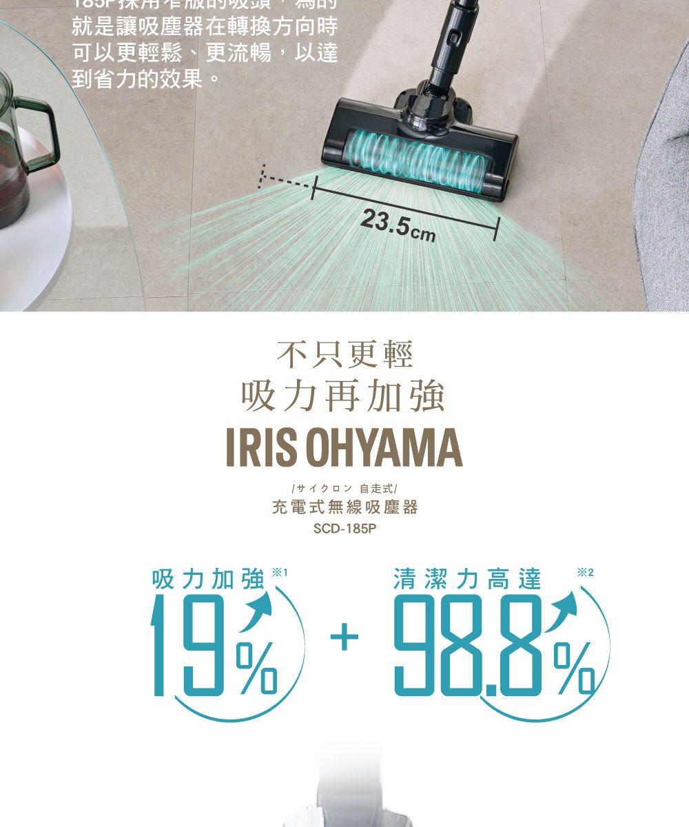 • 極輕量0.85公斤(本體)搭配電動吸頭,讓打掃變得更輕盈