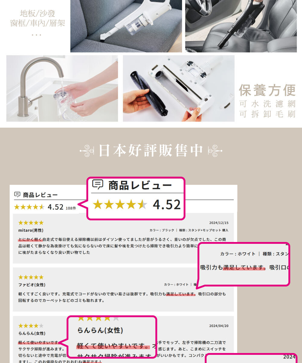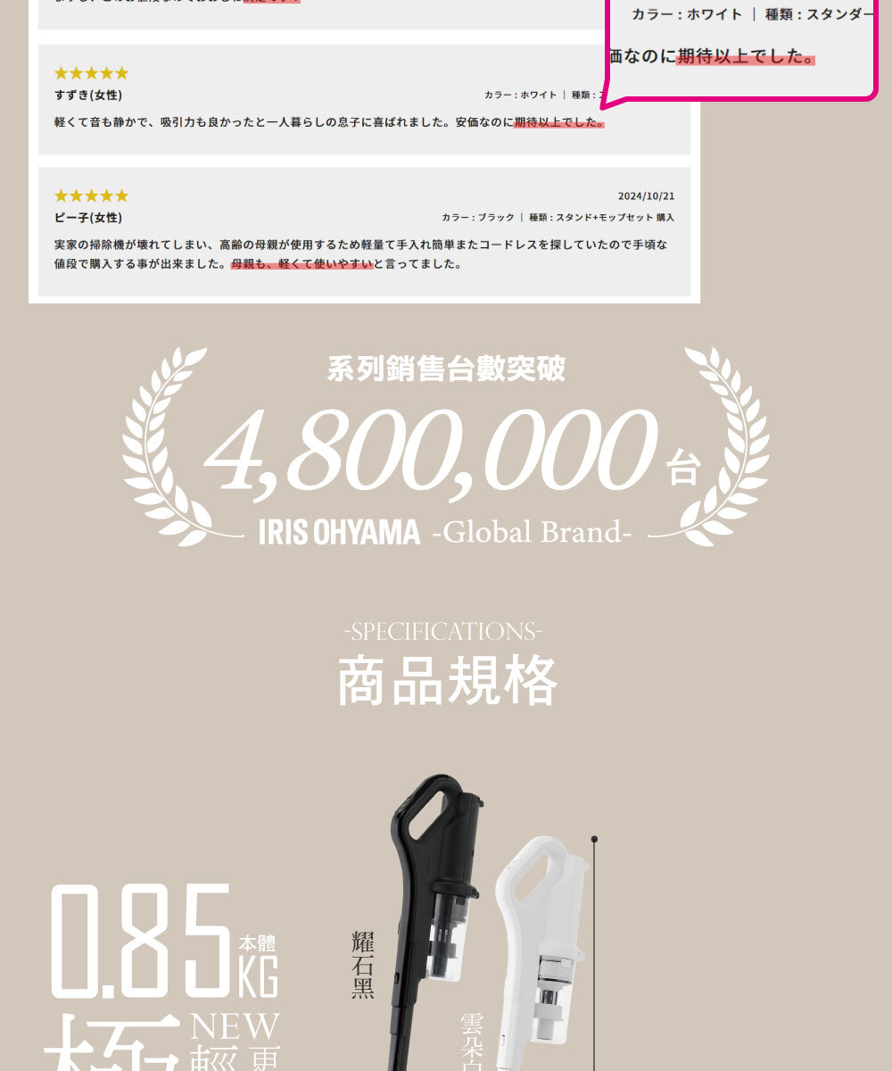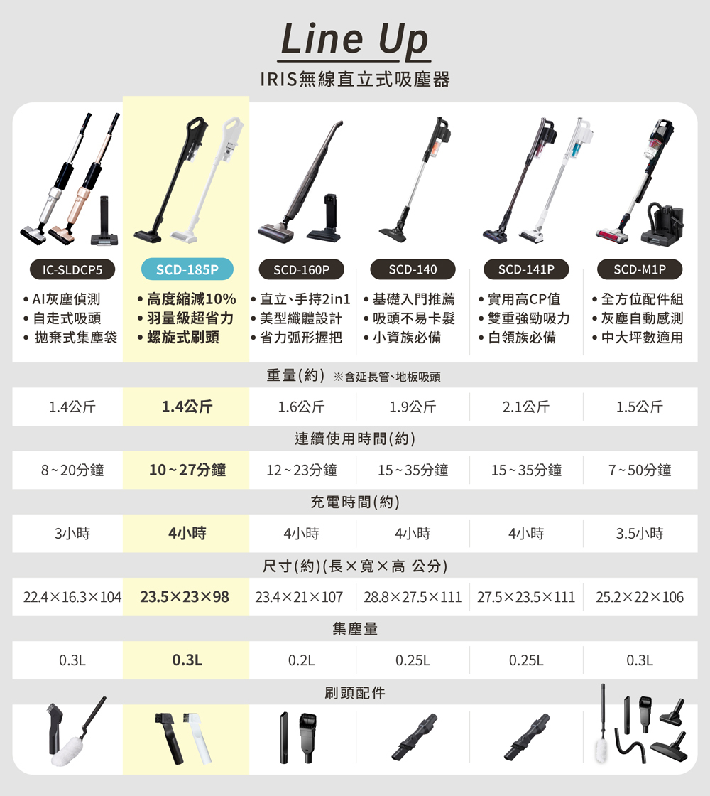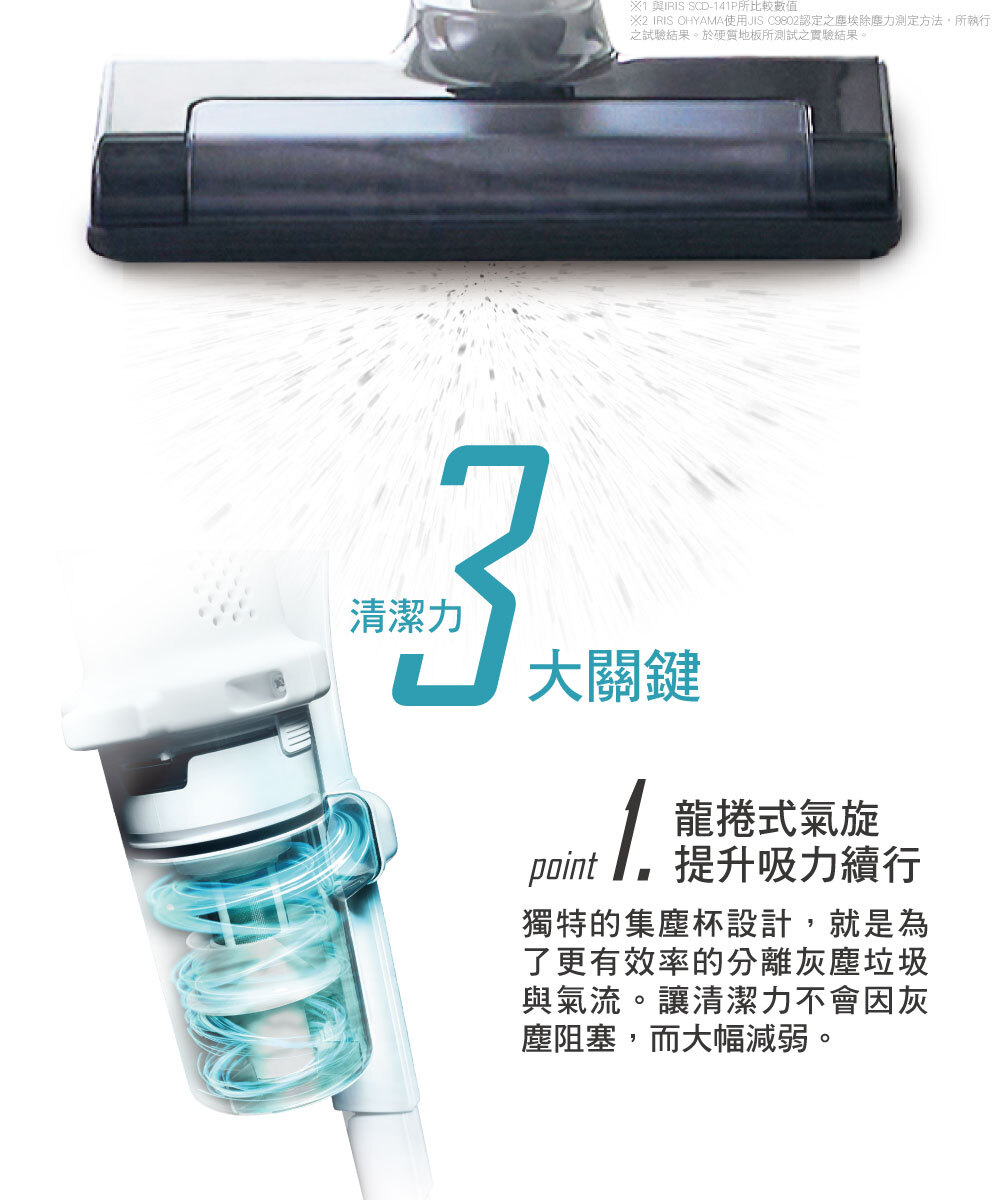 • 極輕量0.85公斤(本體)搭配電動吸頭,讓打掃變得更輕盈