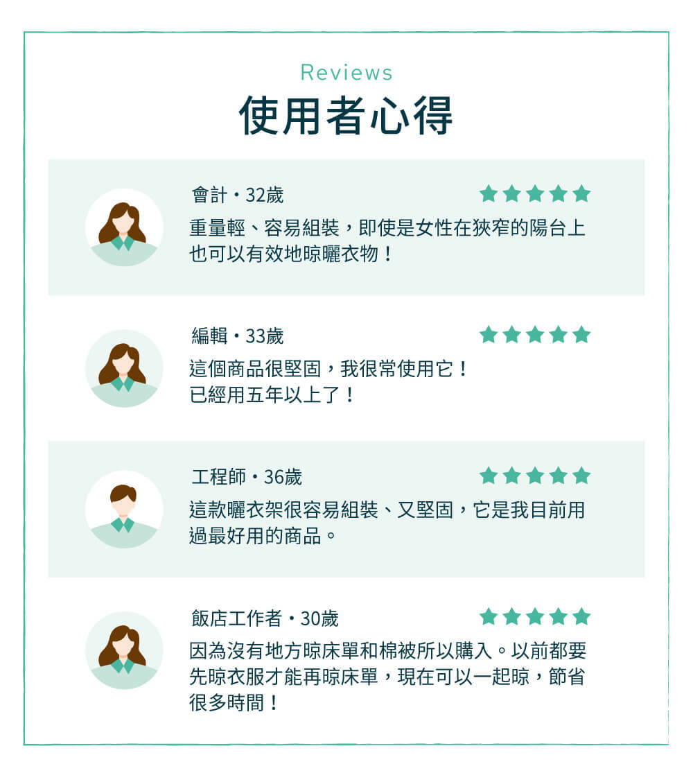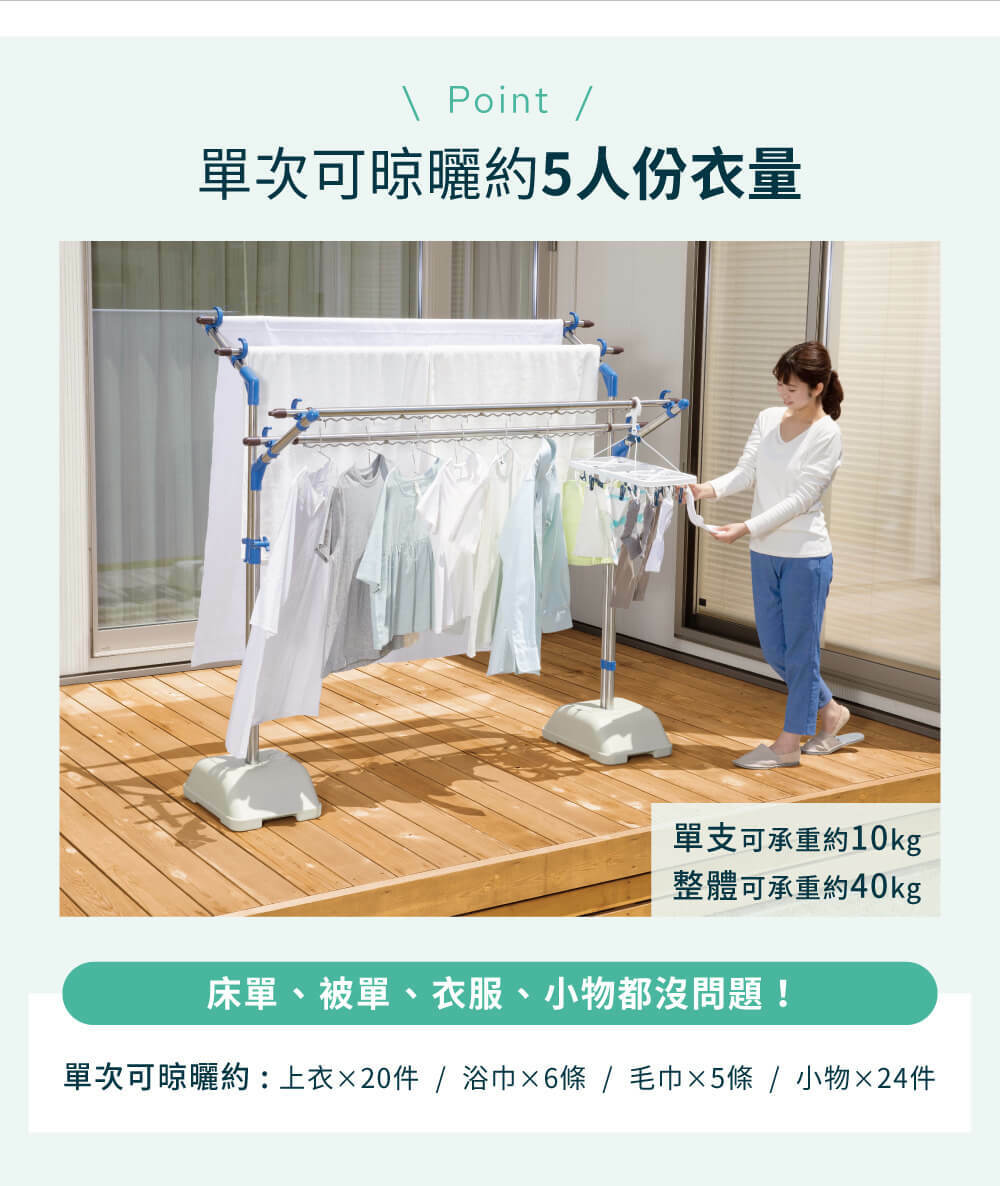 • 可晾曬數量:襯衫20件、浴巾6條、毛巾5條、其他小物24個。
