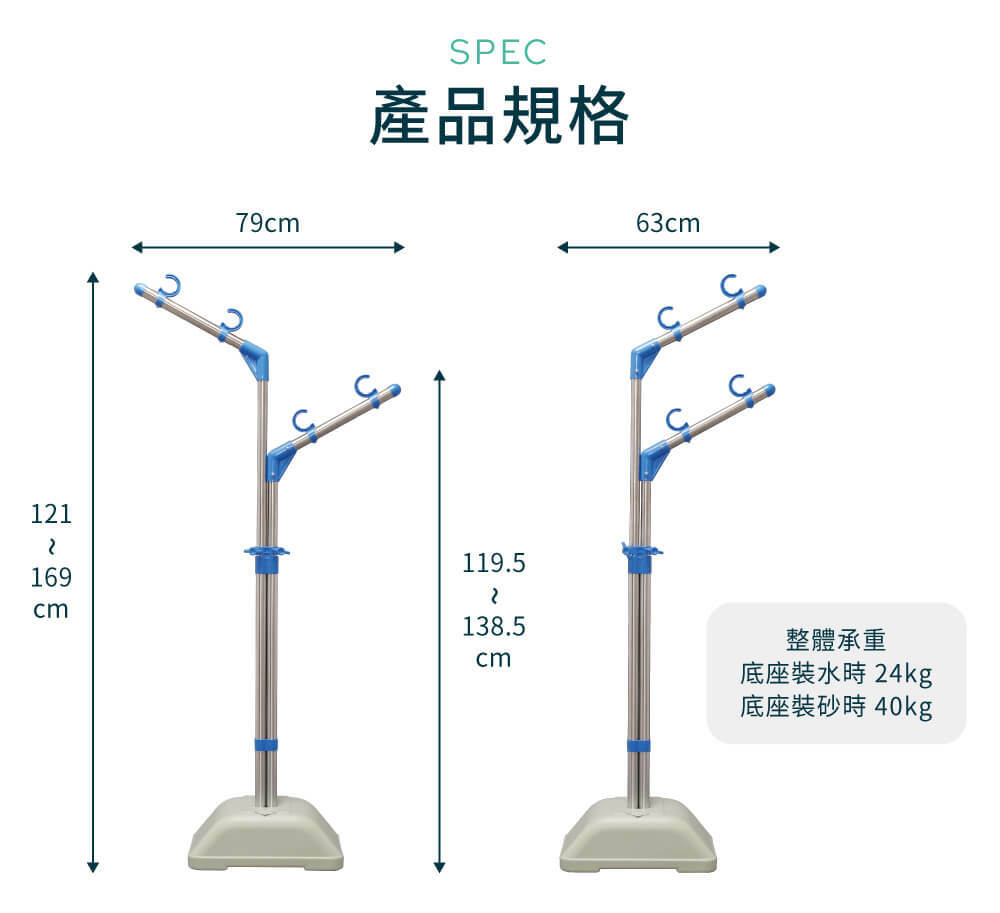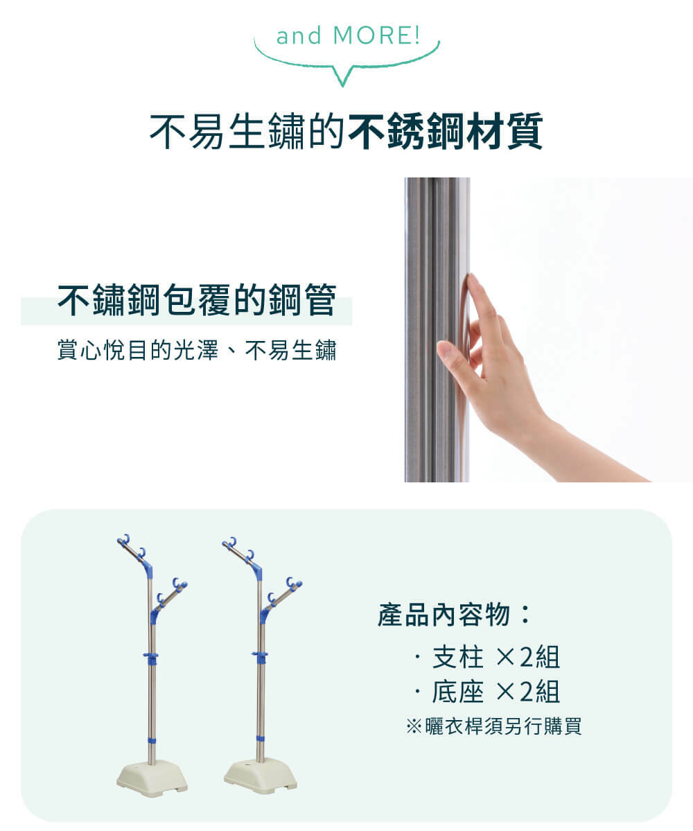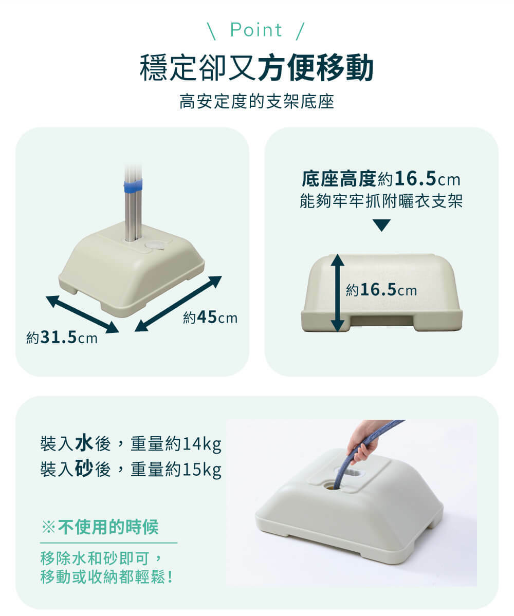 • 抗鏽耐刮不鏽鋼曬衣直立桿、注水/沙底座台,一套兩組的曬衣組合。
