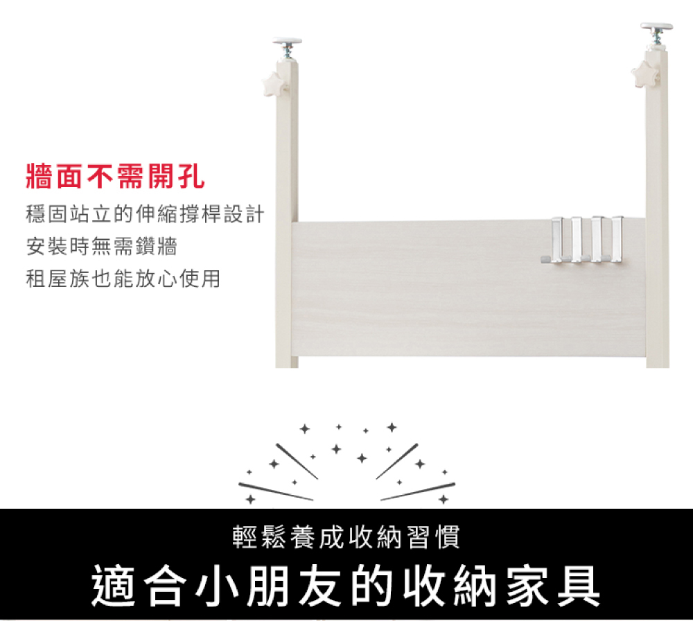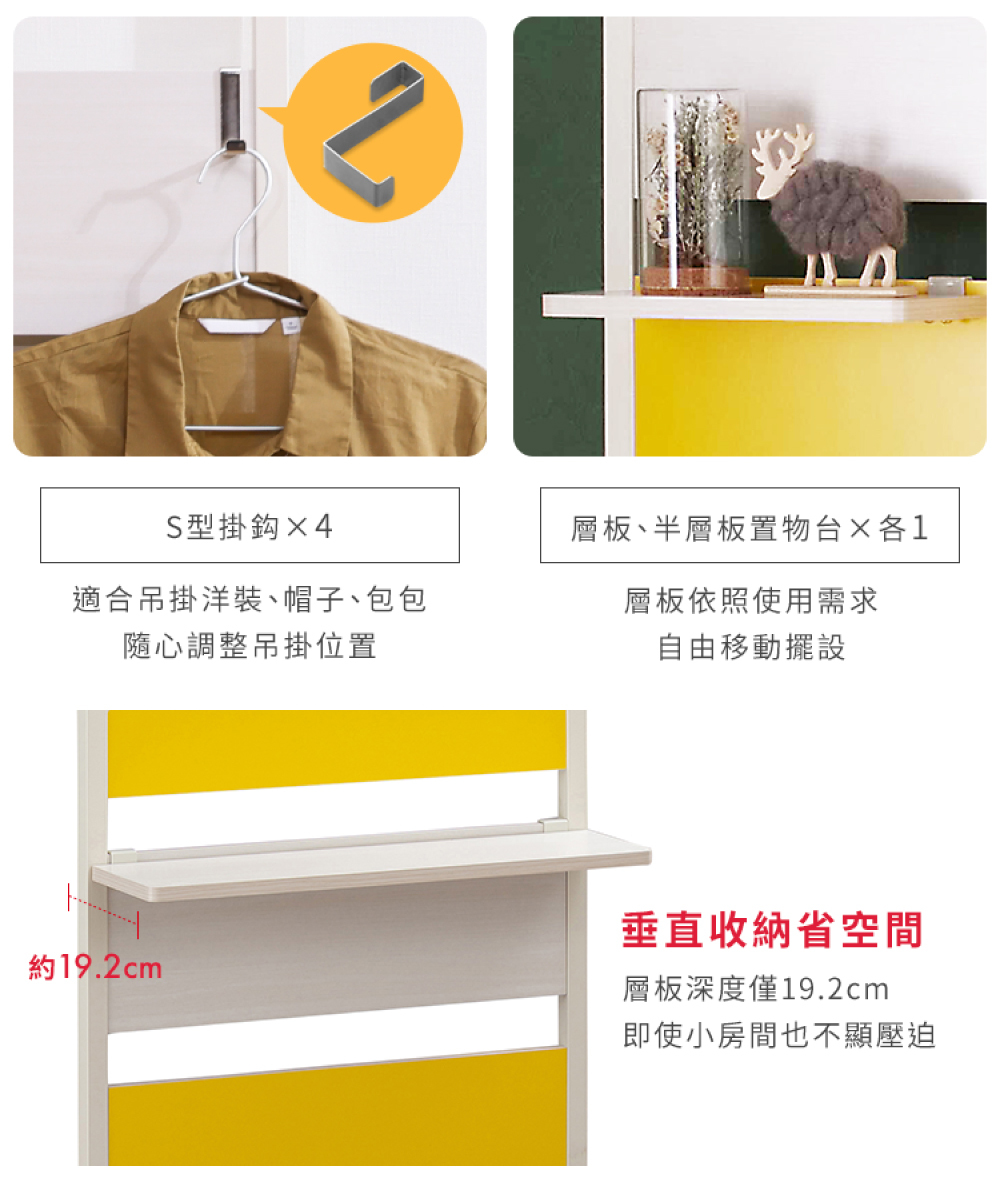 •附贈掛勾及層板,可依使用需求自由搭配收納方式
