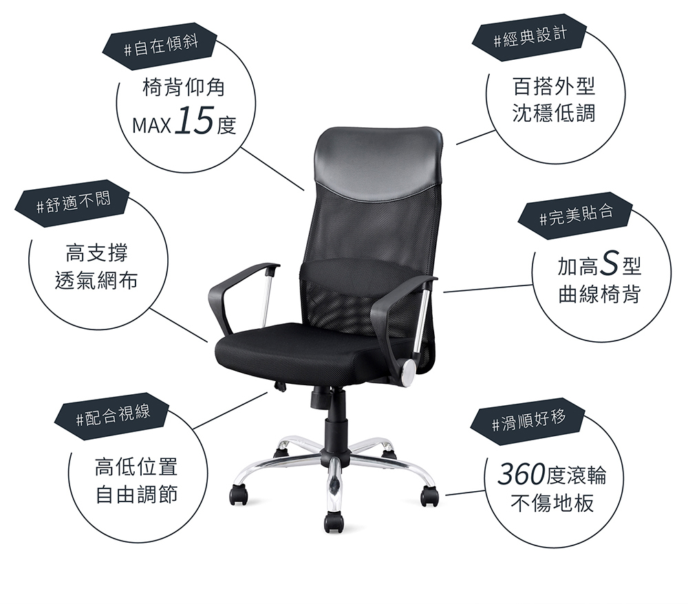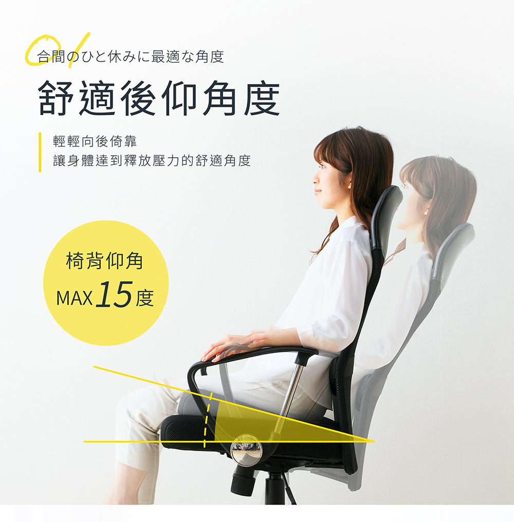 • S字曲線的椅背可貼合身體,加高椅背可支撐肩膀及脖子,分散壓力