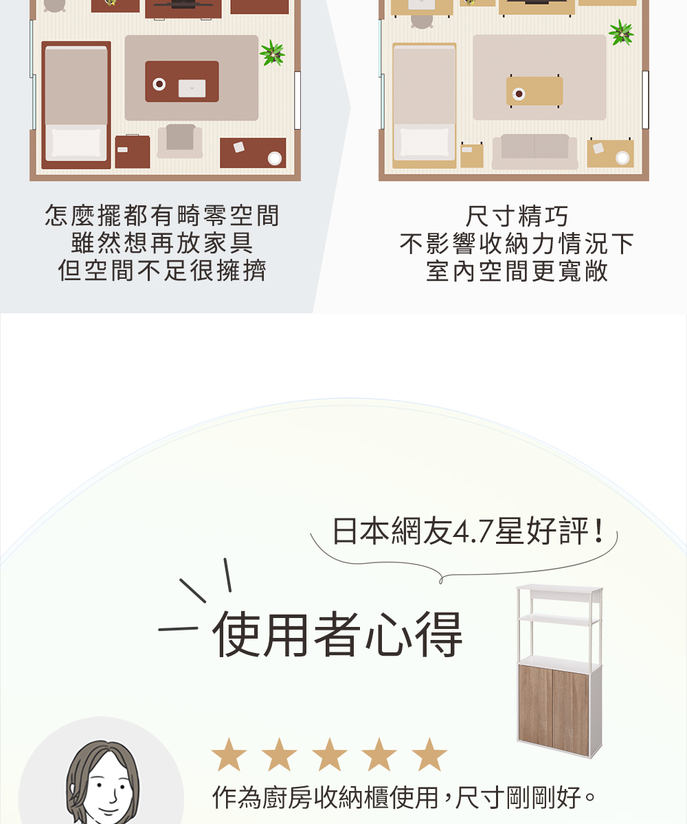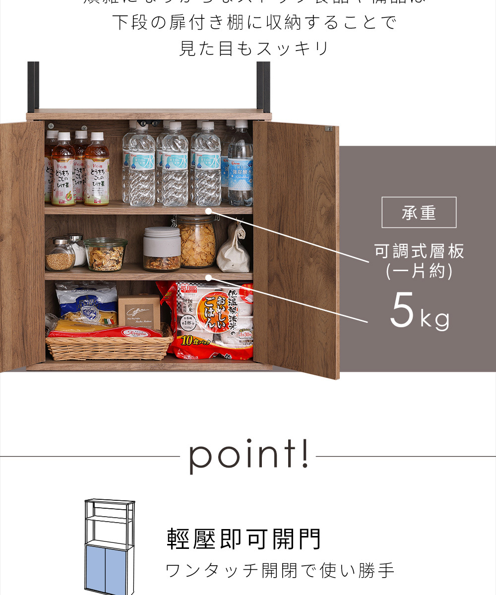 •裝飾層板可用於放置吸引目光或常用的物品,門內可收納食品等儲藏物