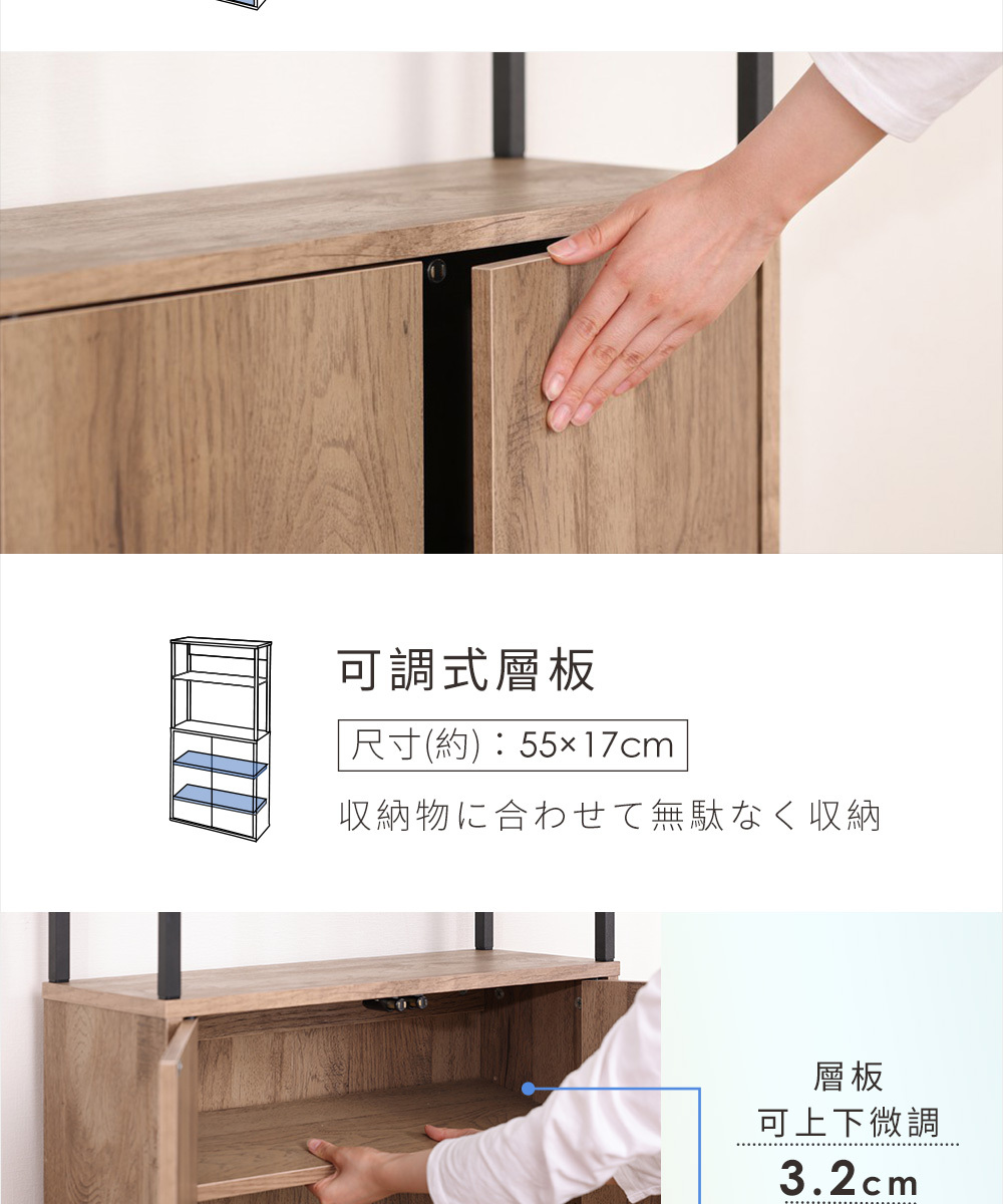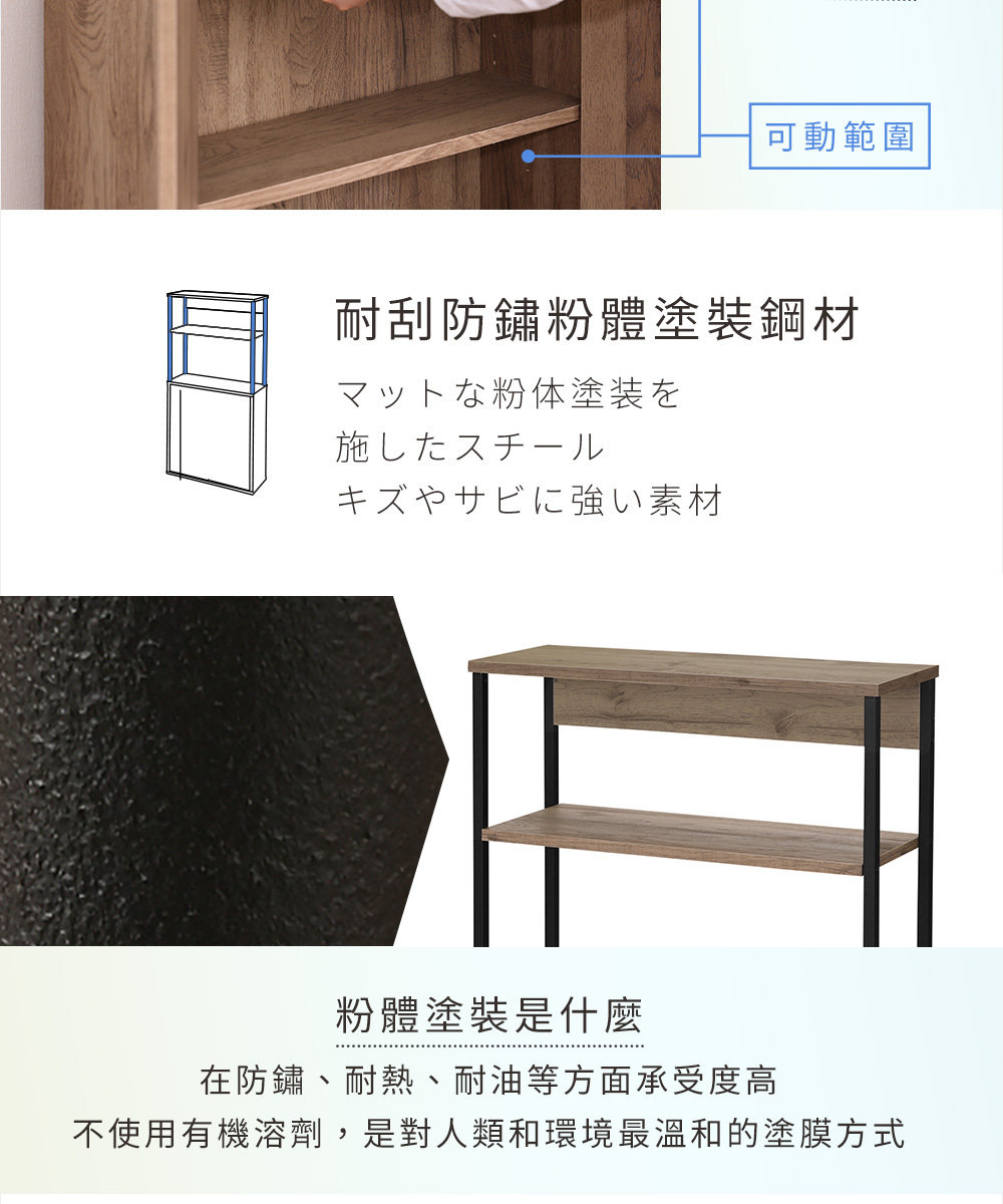 •櫃體上方兩角,可用內附的防傾倒固定片固定兩側,櫃體下方也附有背板固定件可加強固定