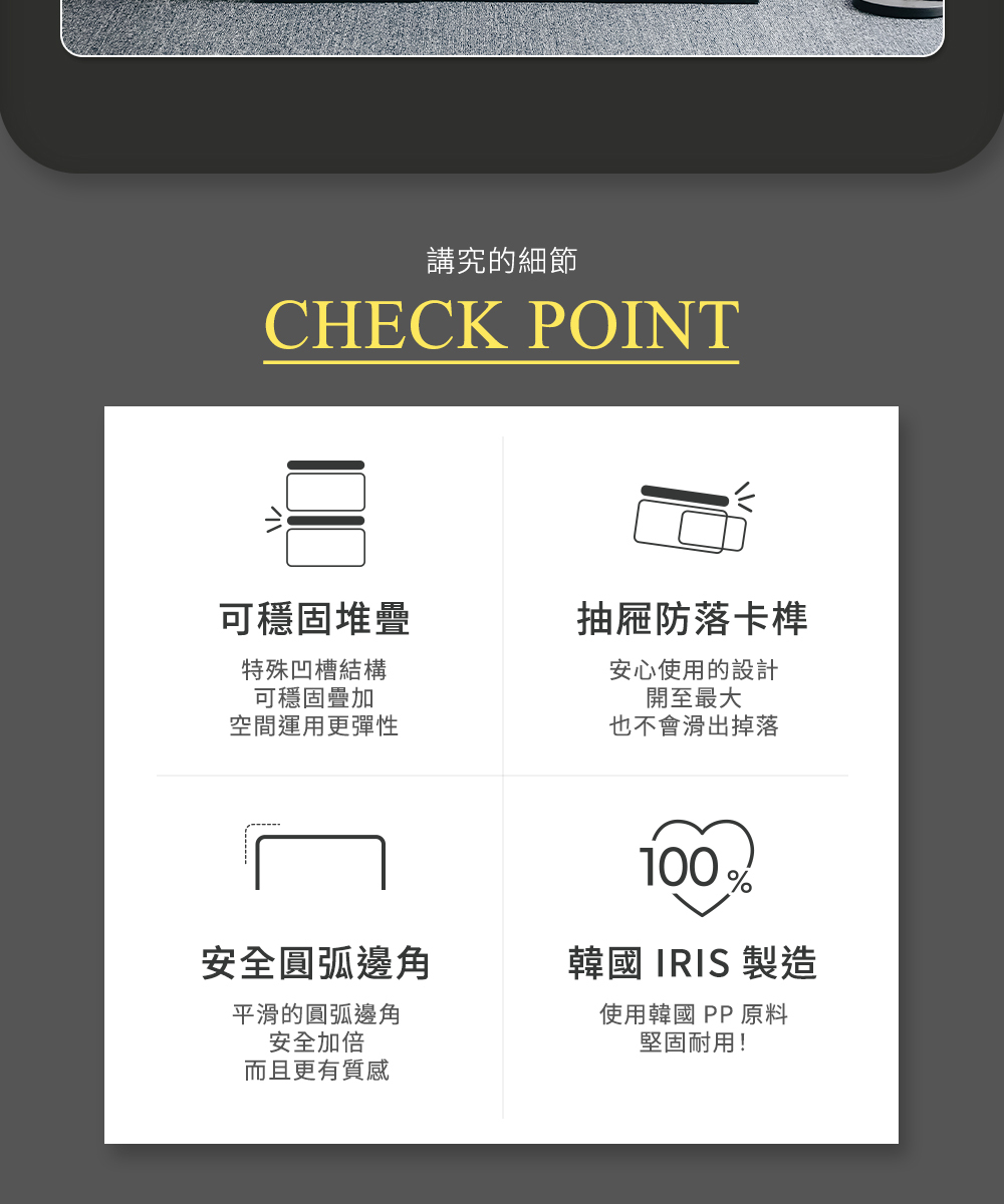 •特殊凹槽結構使堆疊更加穩定,並最大限度的利用空間