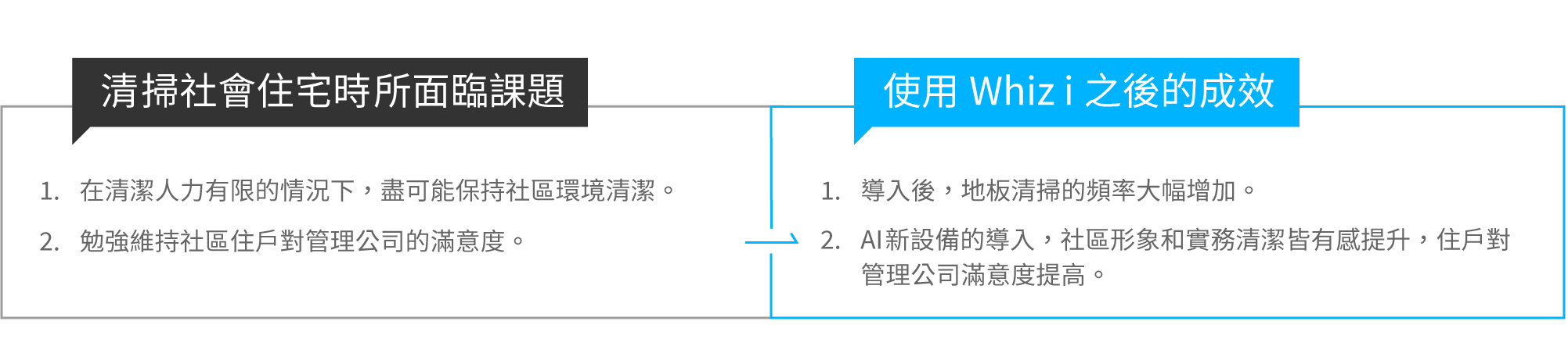 現場清潔人員年齡偏高,因此一開始看到清掃機器人時,心理上對於這類高科技產品會有些排斥。但試用一~二週後,Whiz i操作簡單,馬上就讓清潔人員改觀了。