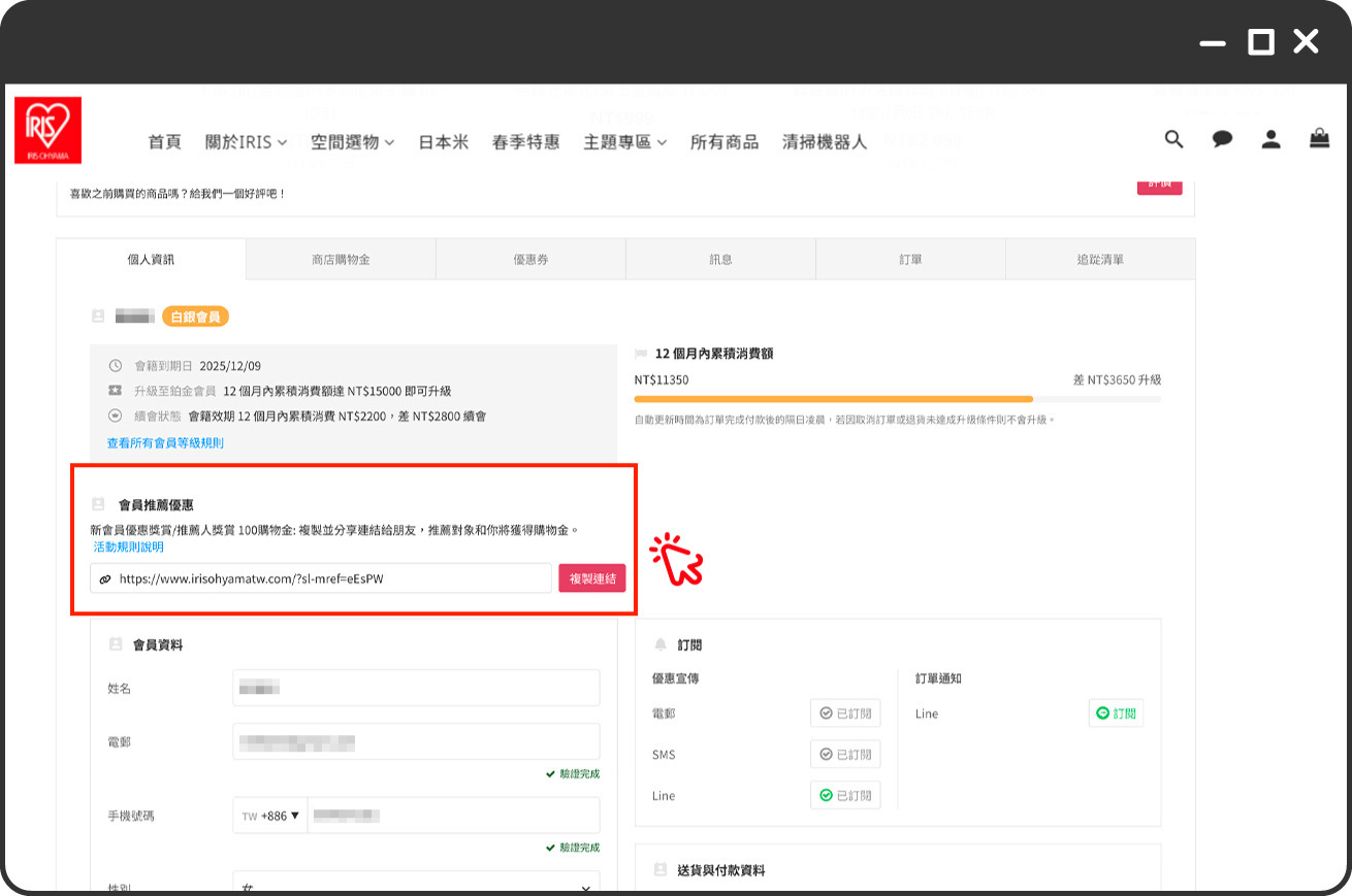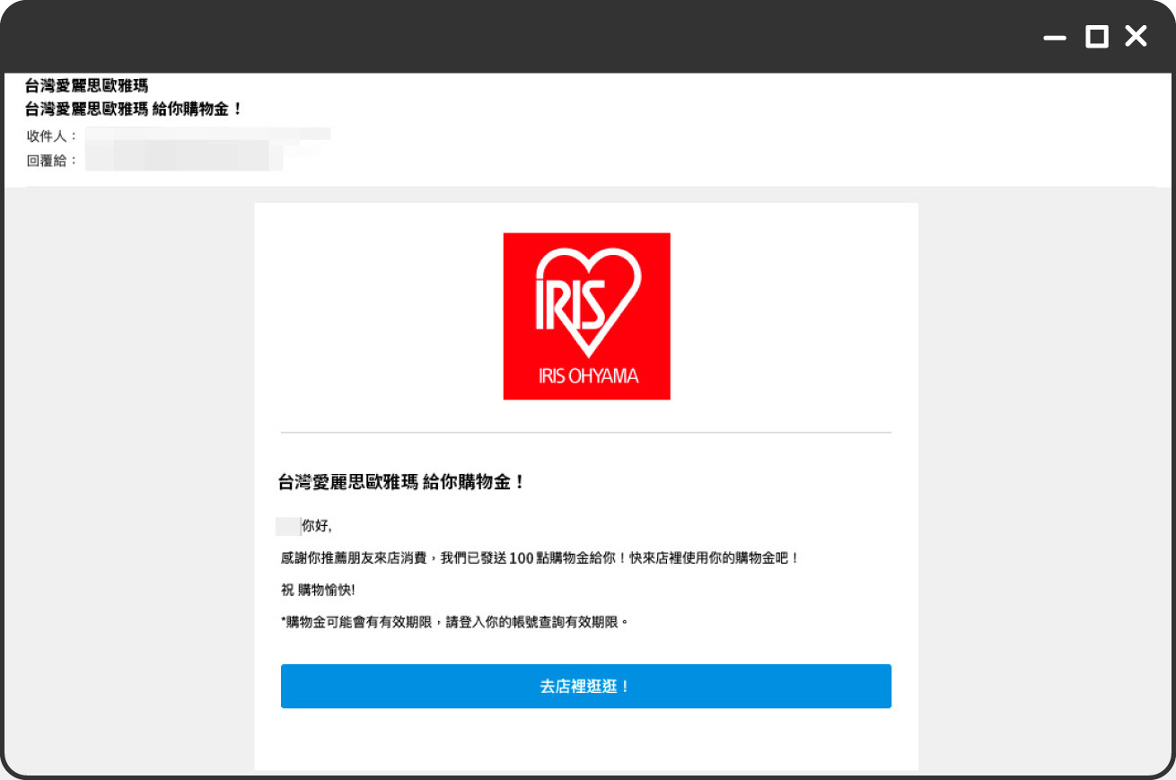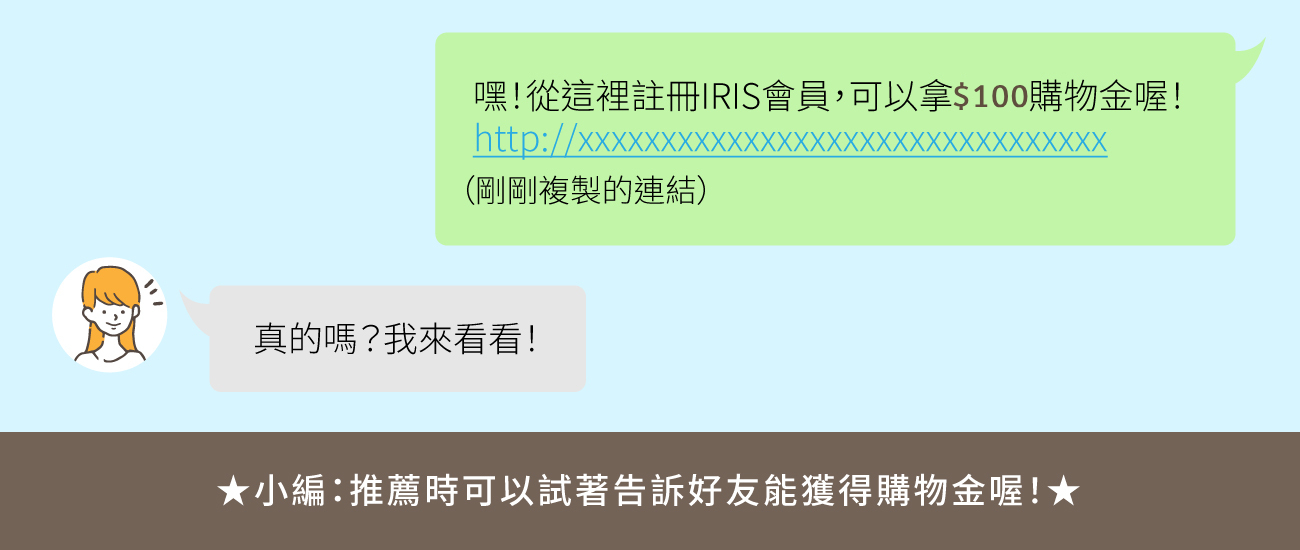 被推薦的好友需為 首次註冊 IRIS OHYAMA 會員,方符合活動獎勵資格。