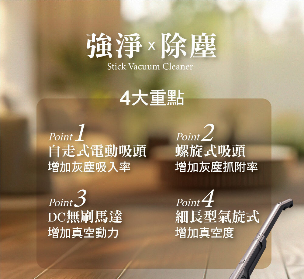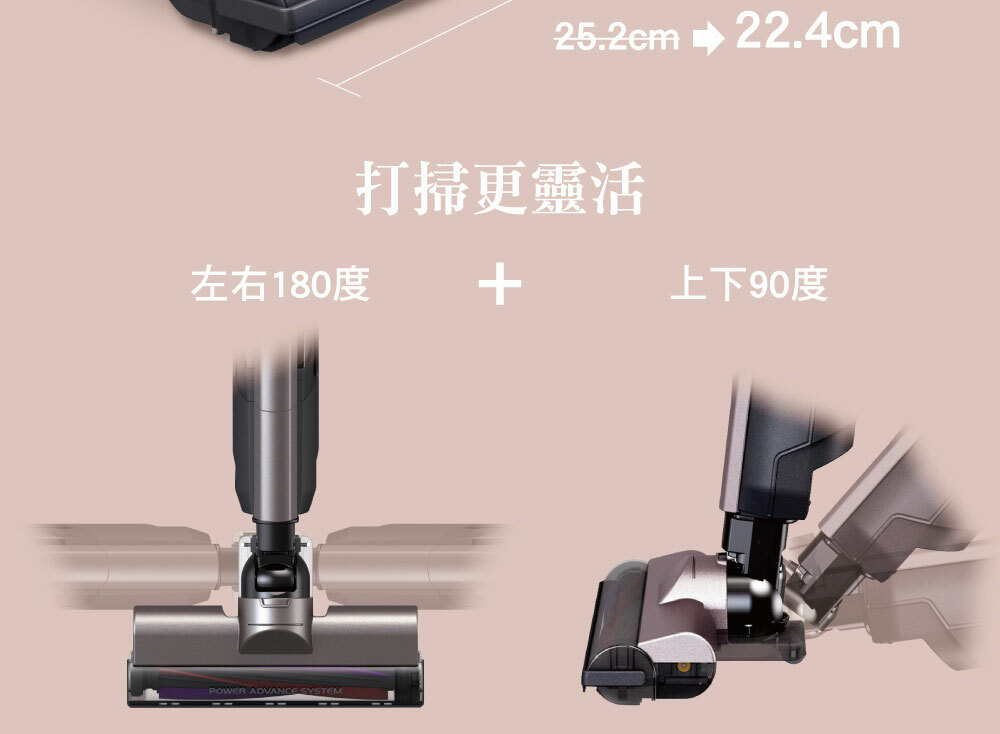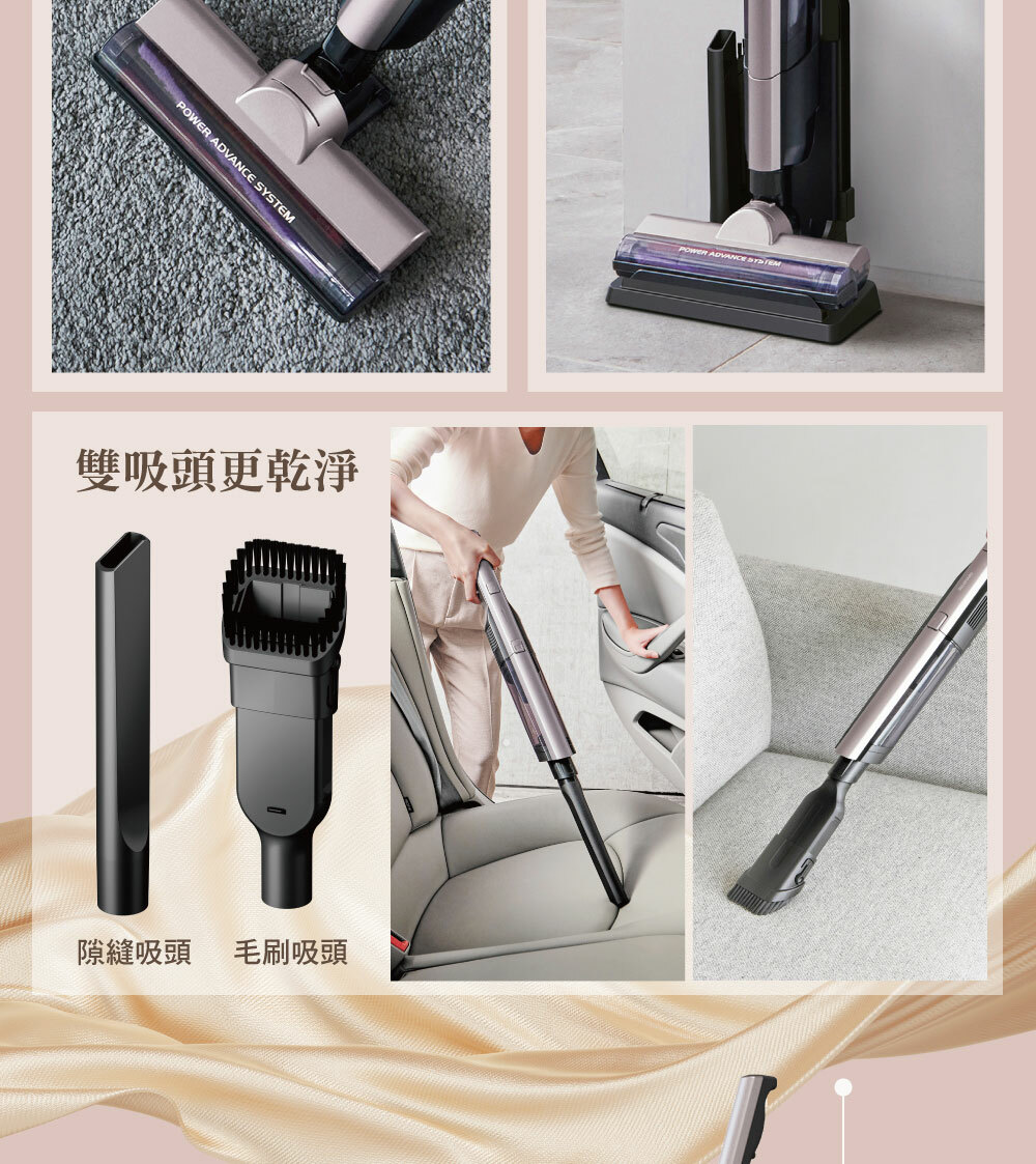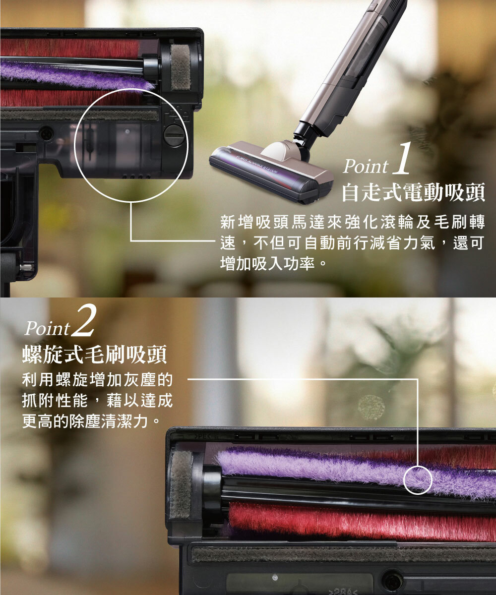 • 搭載自走式電動吸頭,不僅省力還額外增加吸入功率