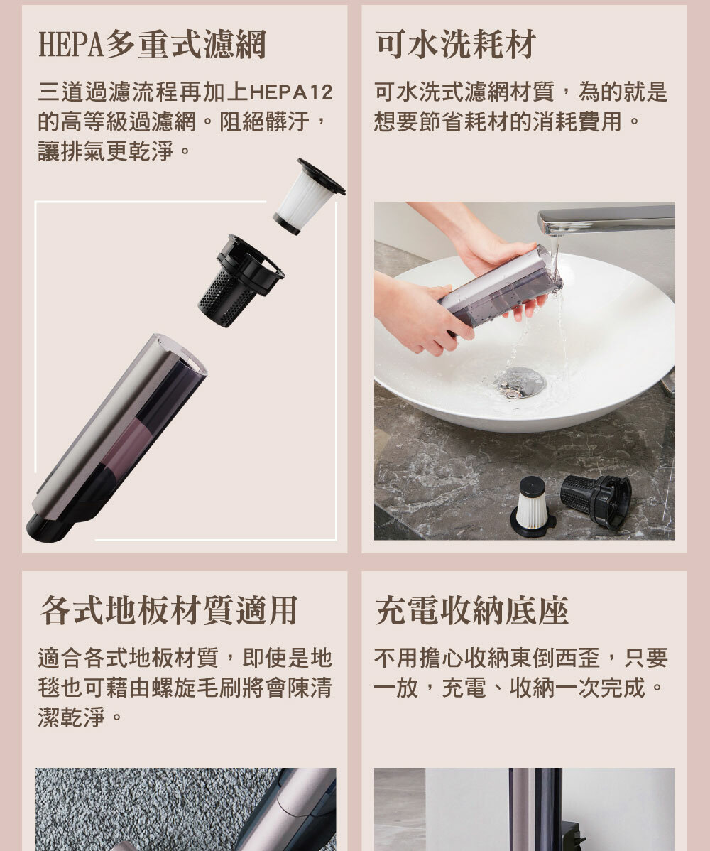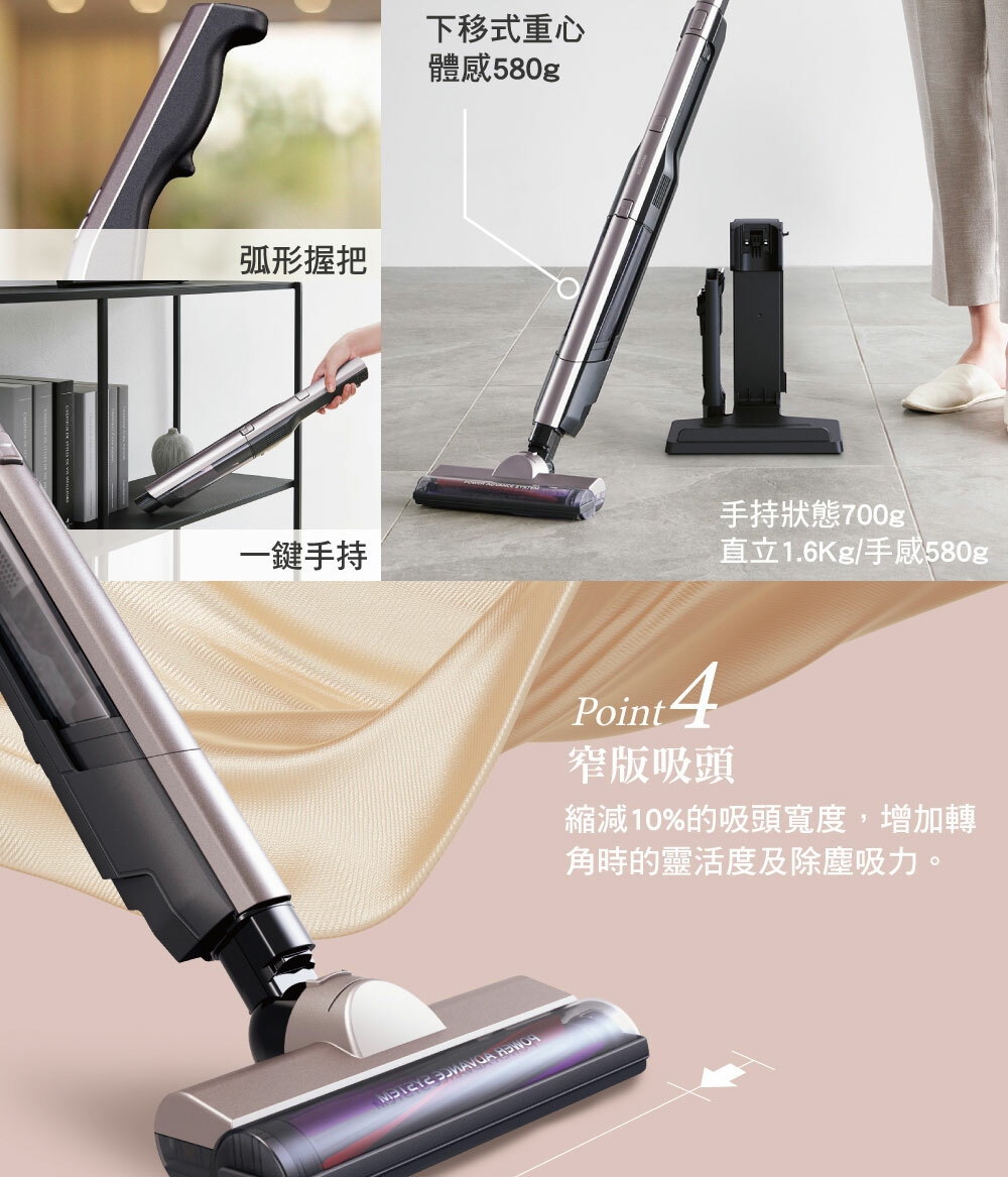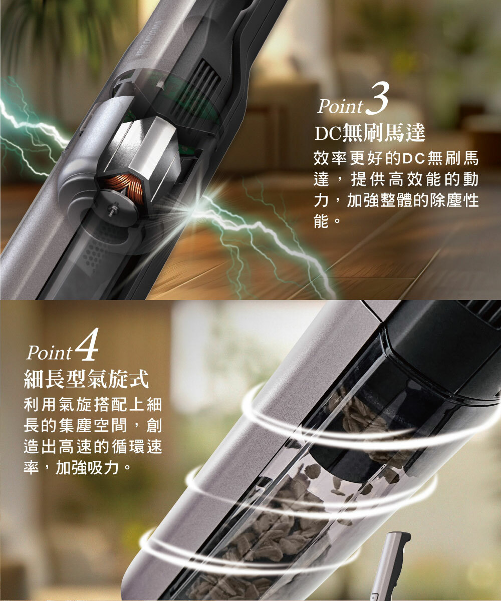 • 搭載自走式電動吸頭,不僅省力還額外增加吸入功率