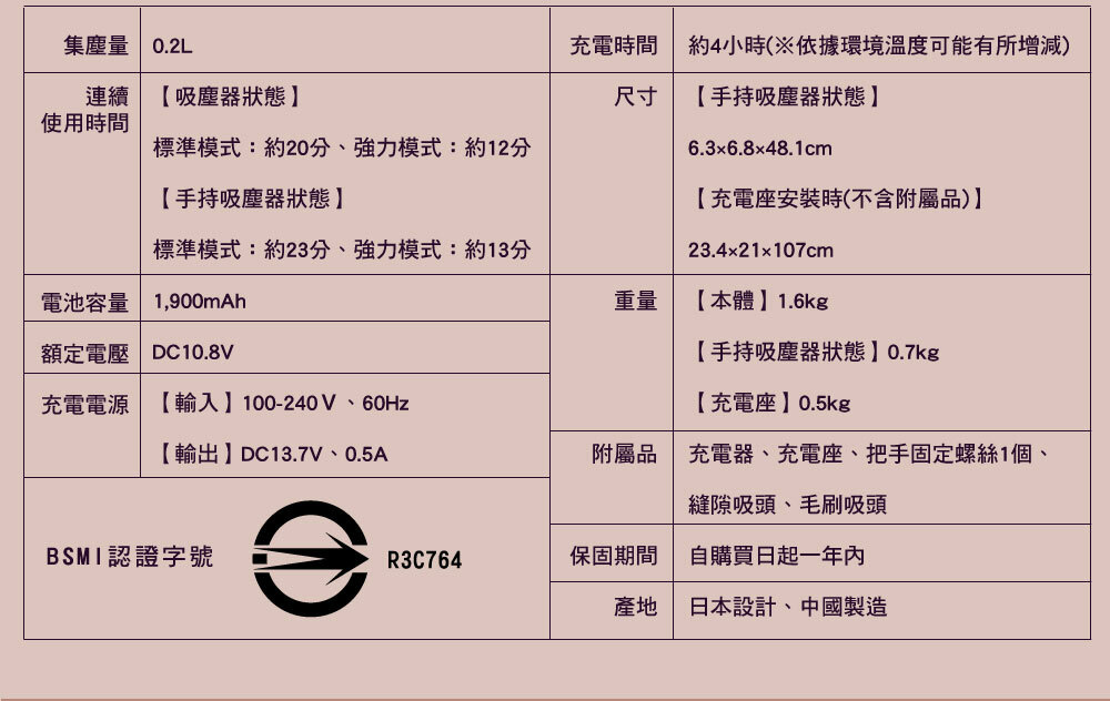 • 附有隙縫吸頭及毛刷吸頭,