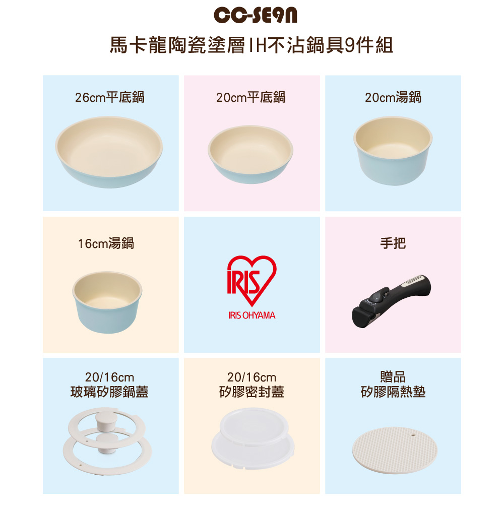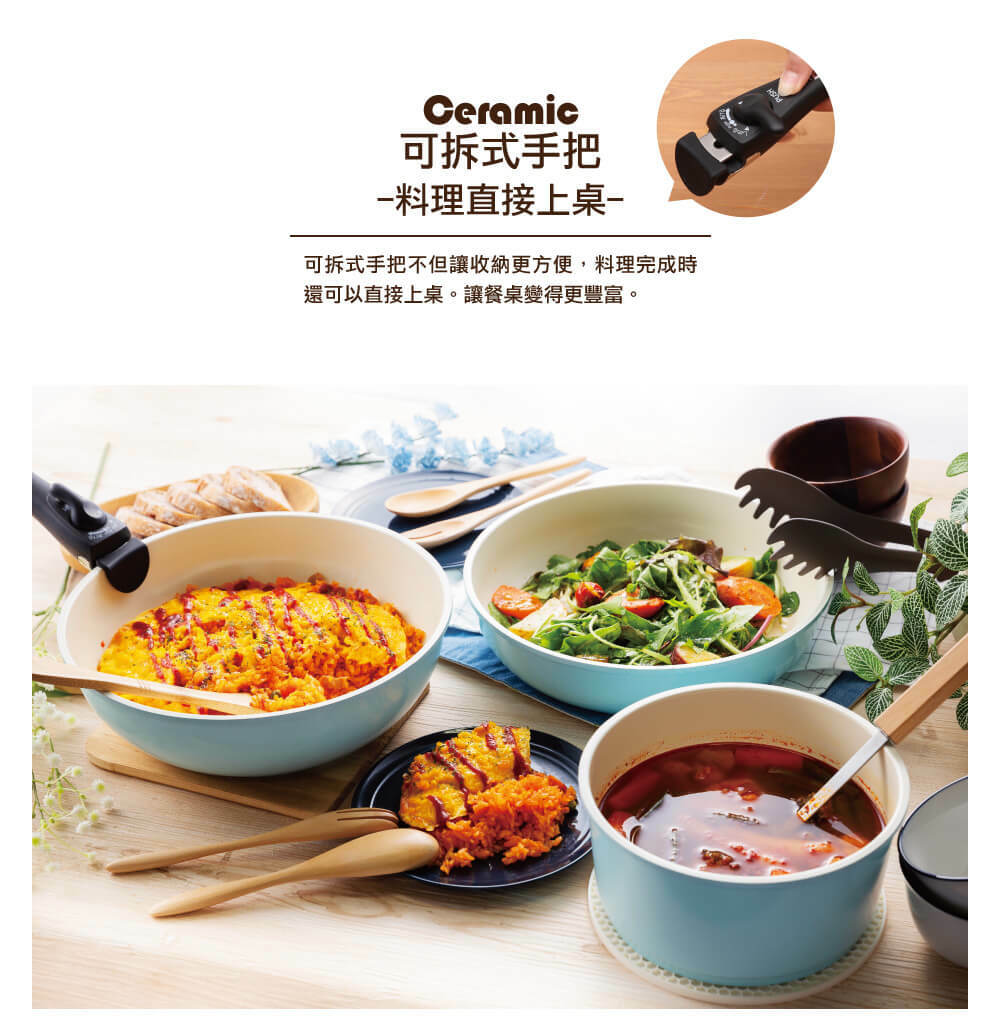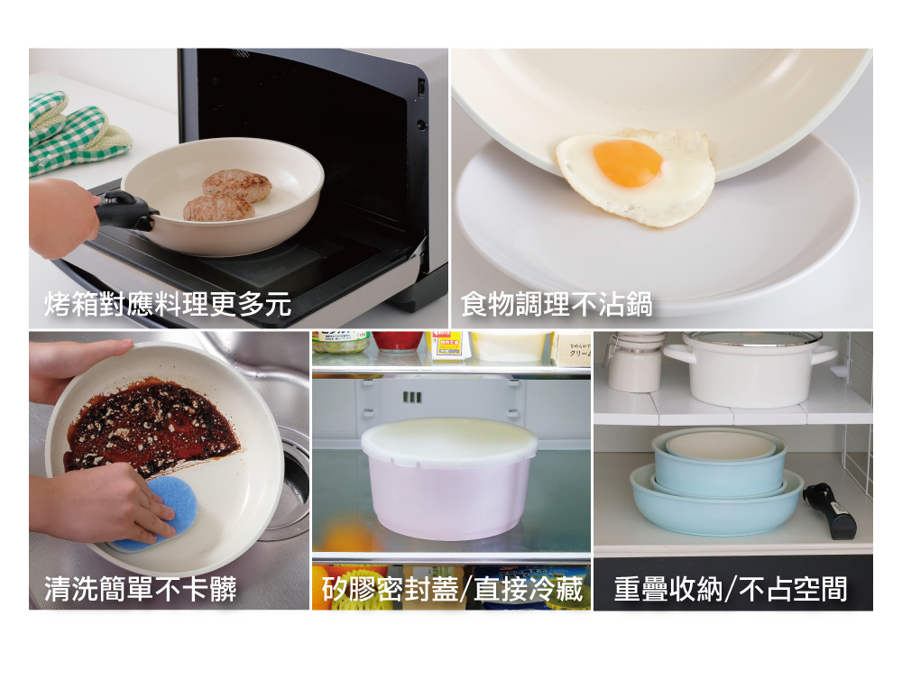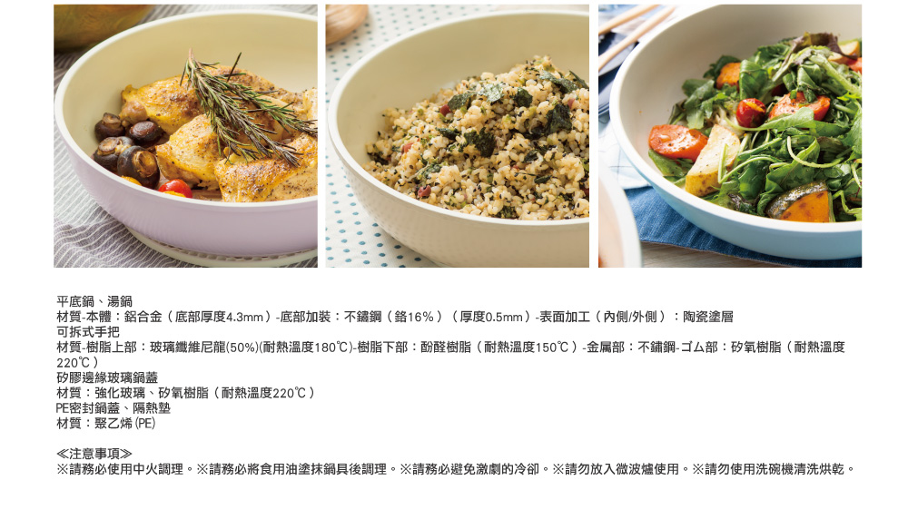 矽膠玻璃鍋蓋:16/20cm、PE密封蓋:16/20cm、可拆式把手、隔熱鍋墊