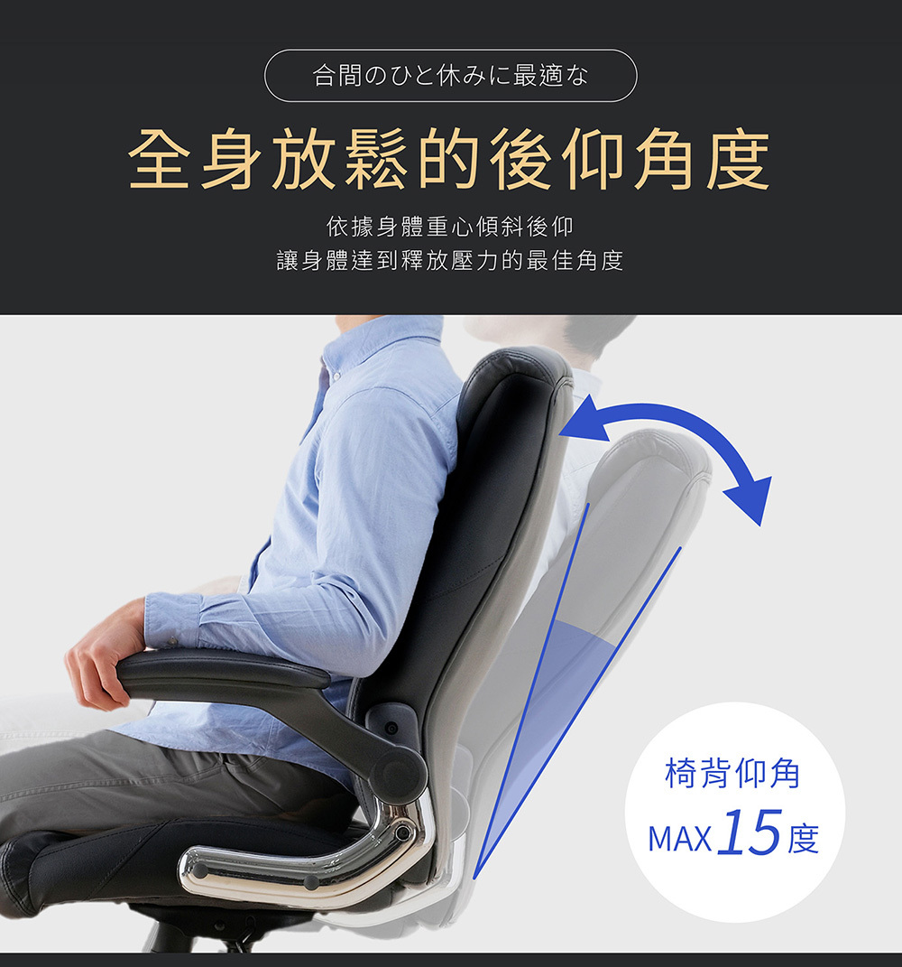 • 椅背可調整角度約15度,依照喜好使用習慣自由調整