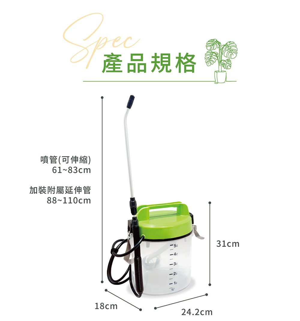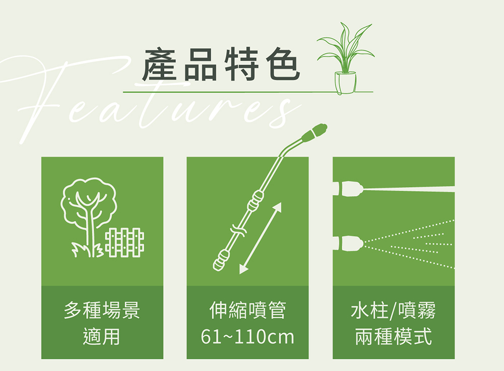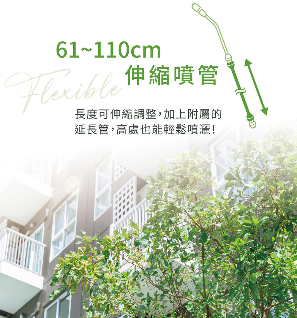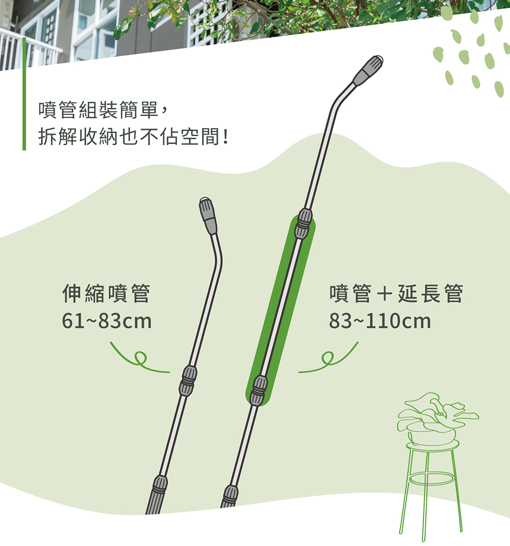 • 裝上附屬的延長管後,噴嘴最大可延長至110cm