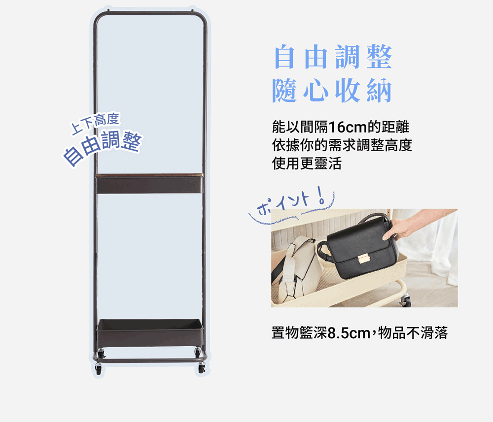 • 深8.5cm收納籃可上下調整高度,收納更靈活