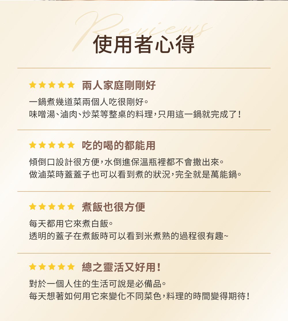 • 一鍋多功能,外型小巧,使用、收納都簡單,小套房煮飯的最佳夥伴