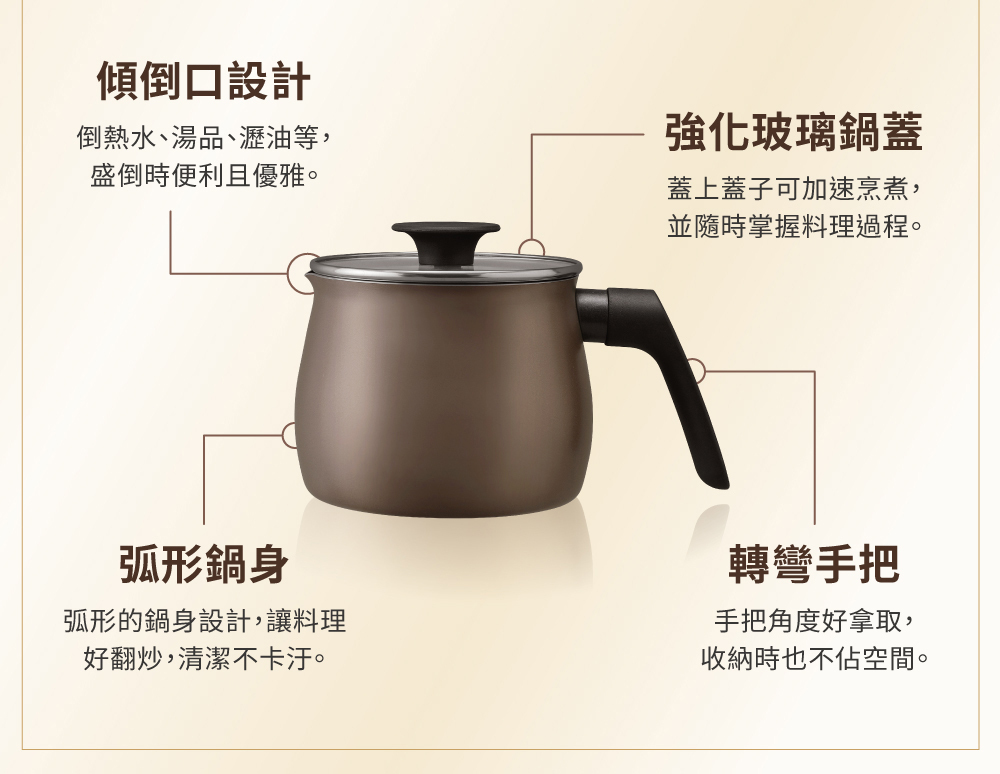 • 鍋緣有倒口設計,方便倒出醬料與湯汁,不易潑灑,減少弄髒桌子的機會