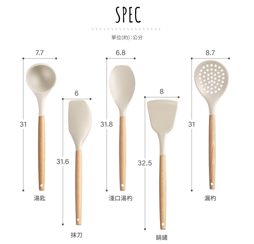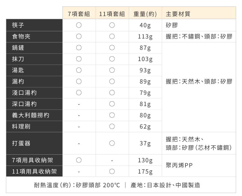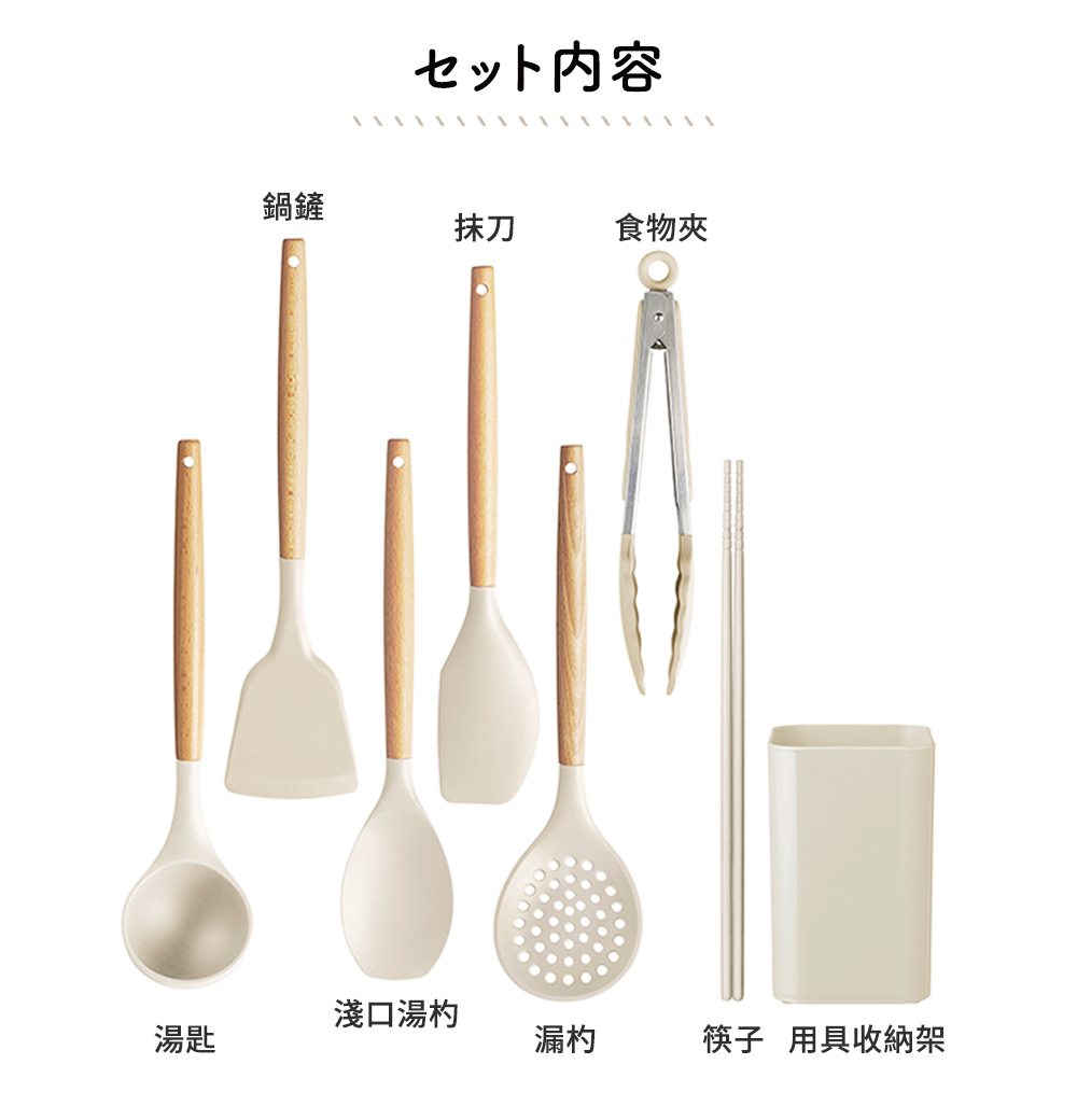 •組合內含:鍋鏟、湯匙、漏杓、淺口湯杓、抹刀、筷子、食物夾、用具收納架