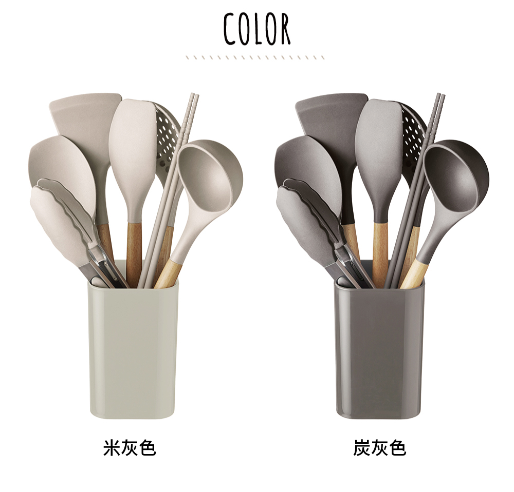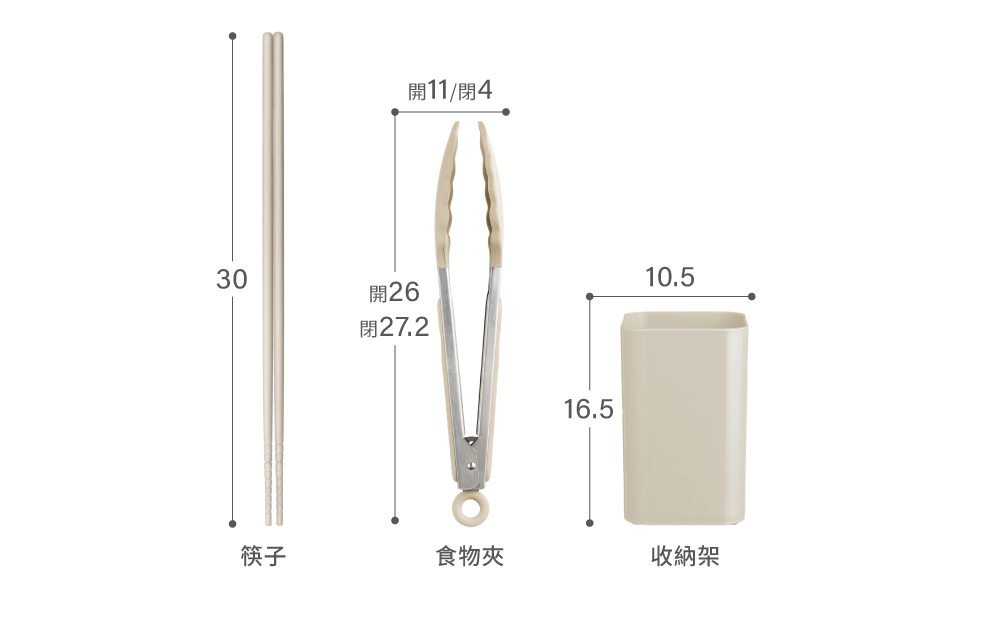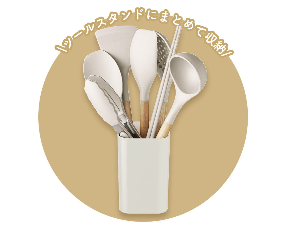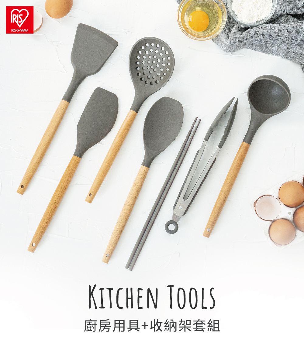 •組合內含:鍋鏟、湯匙、漏杓、淺口湯杓、抹刀、筷子、食物夾、用具收納架