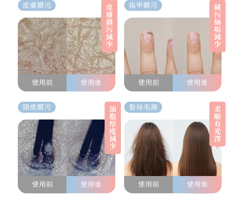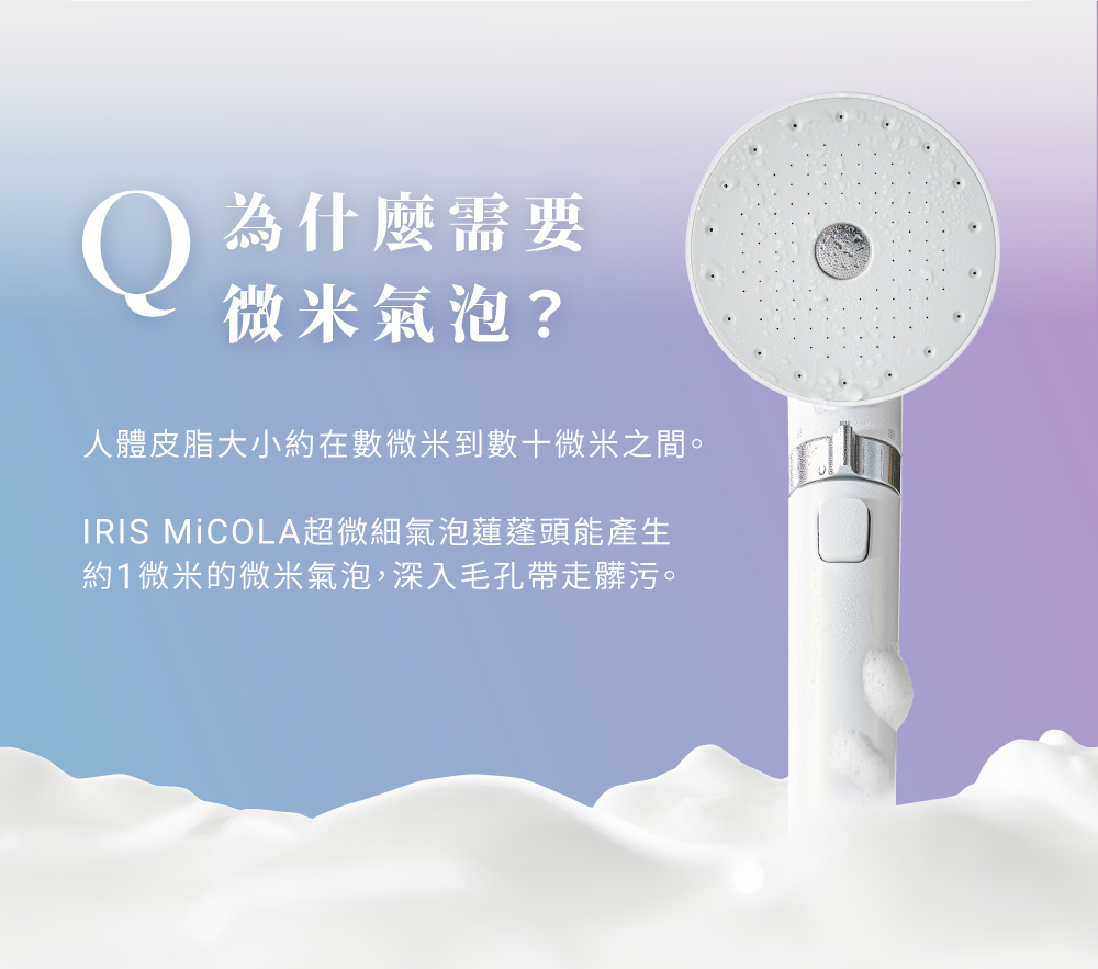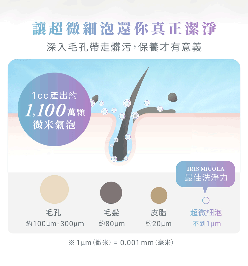 • 比毛孔細小的微米氣泡,深層清潔帶走髒污