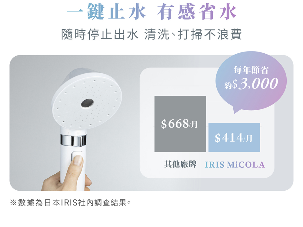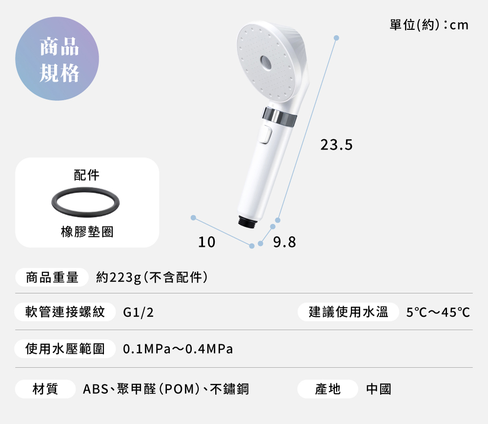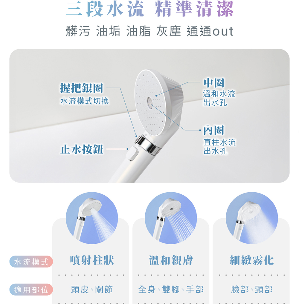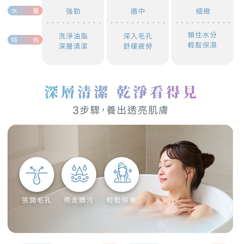 • 大面積出水板、三段出水、止水鍵設計,讓洗澡成為日常保養的一環