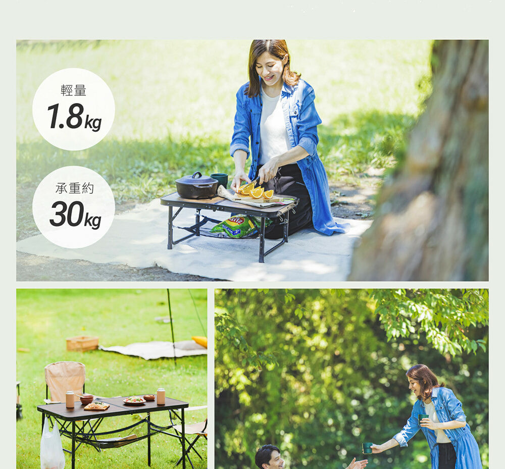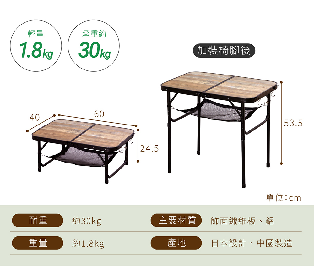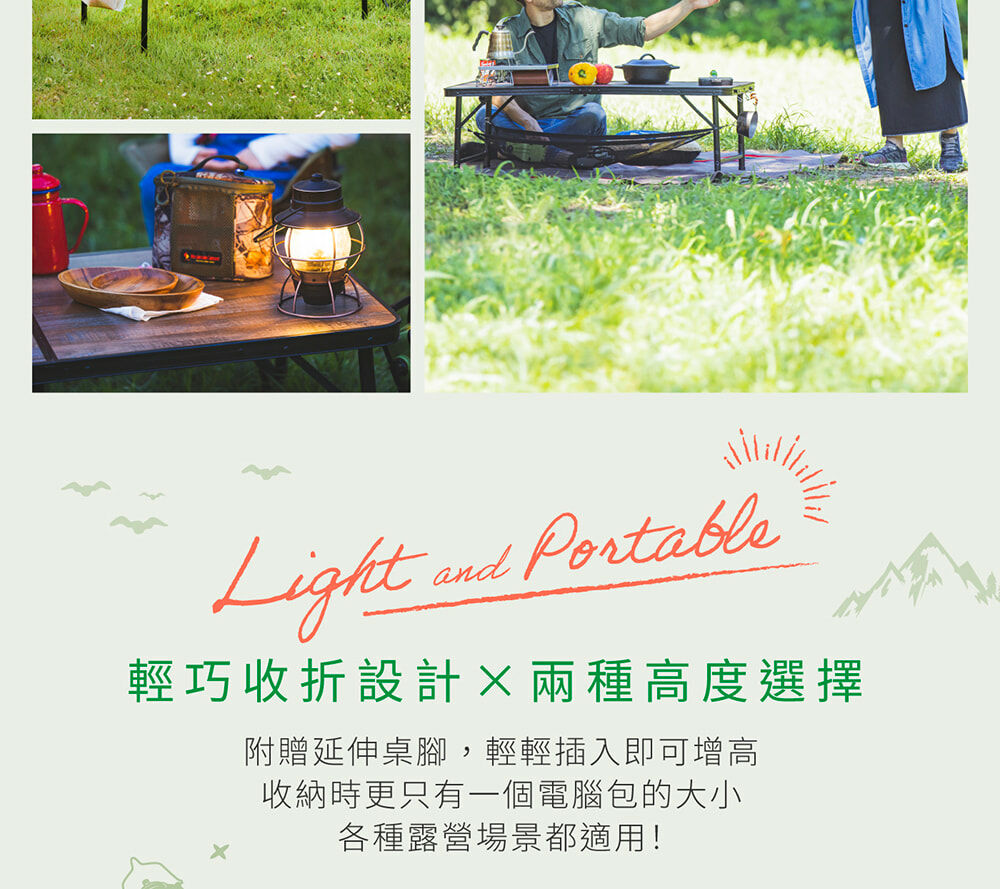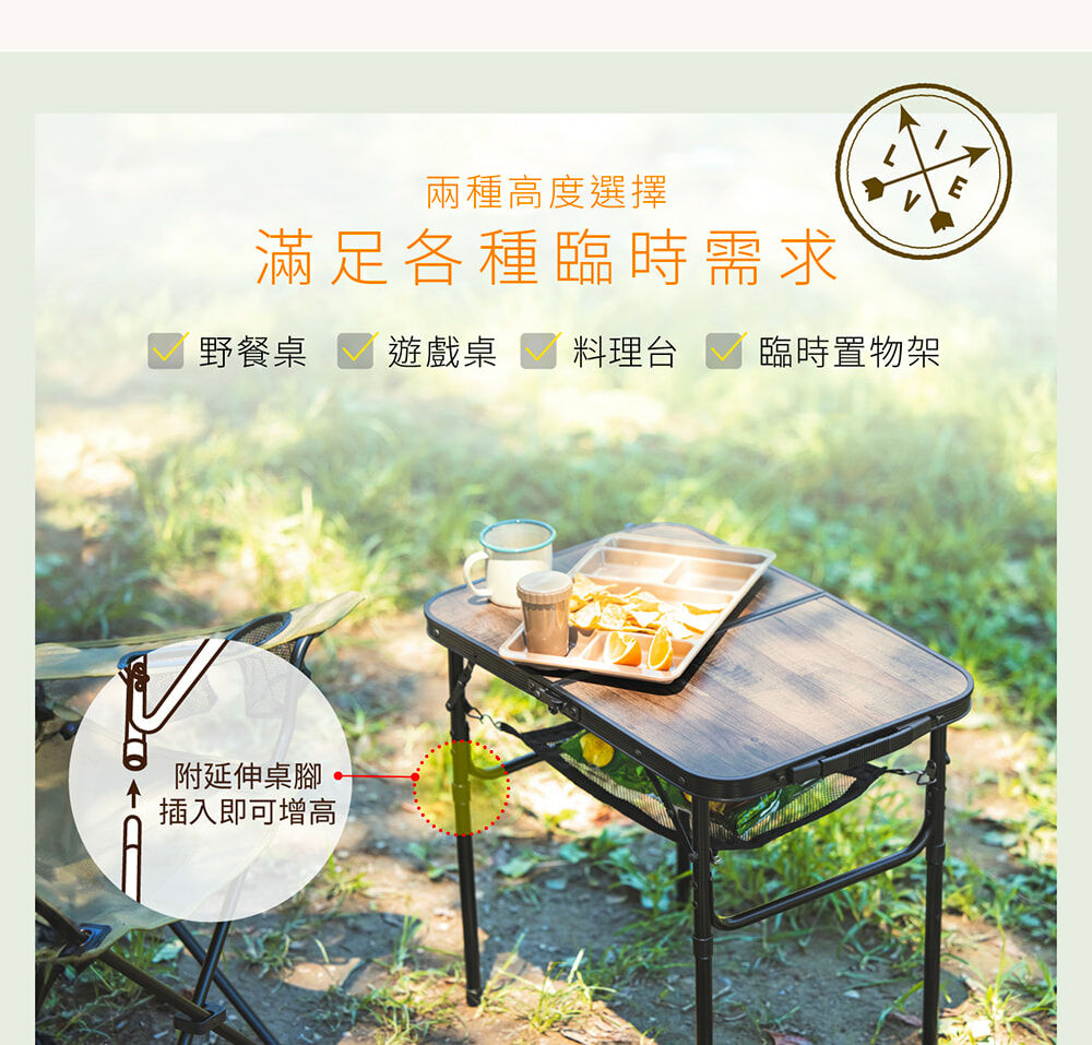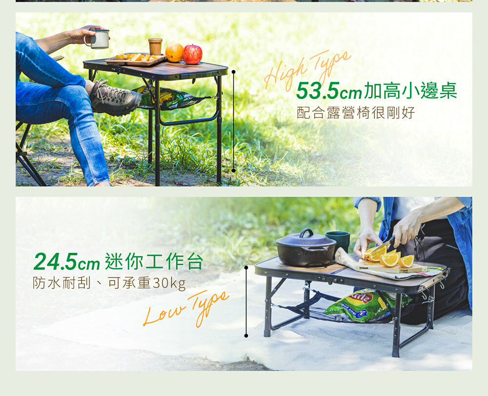 • 適合戶外的木質調設計,桌子高度可依需求調整24.5或53.5公分,各種戶外場合都能方便使用