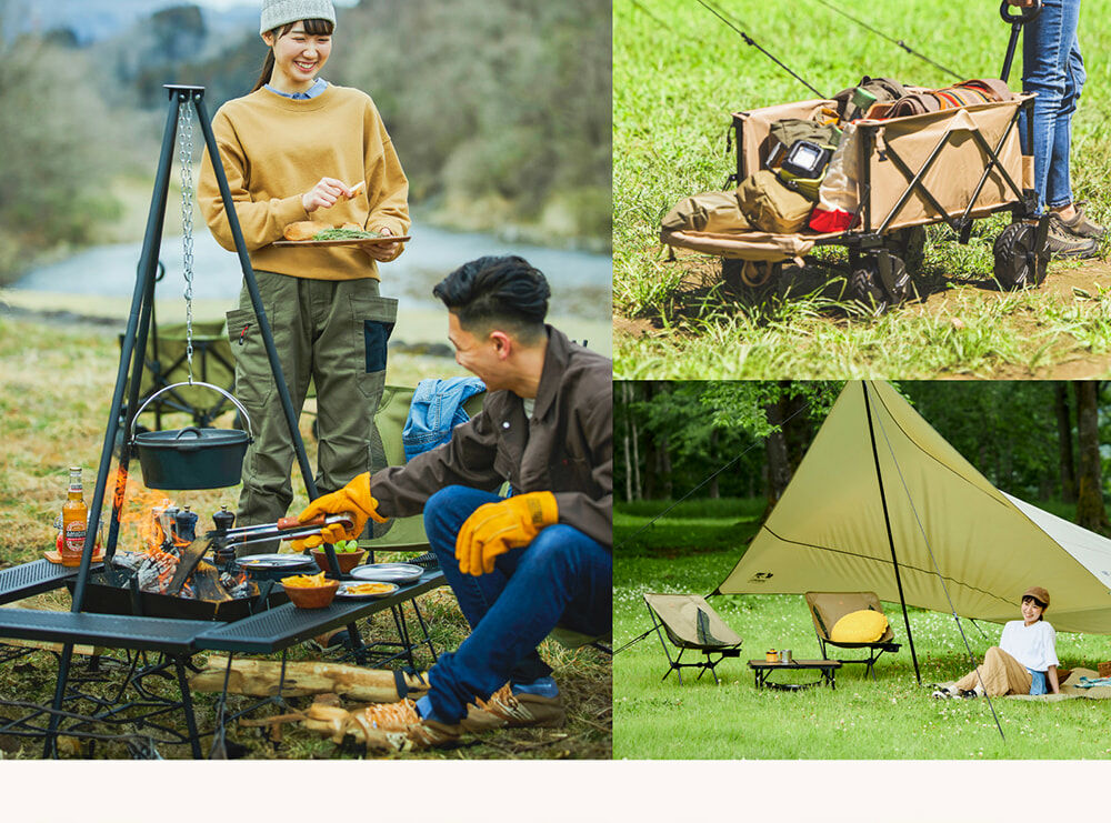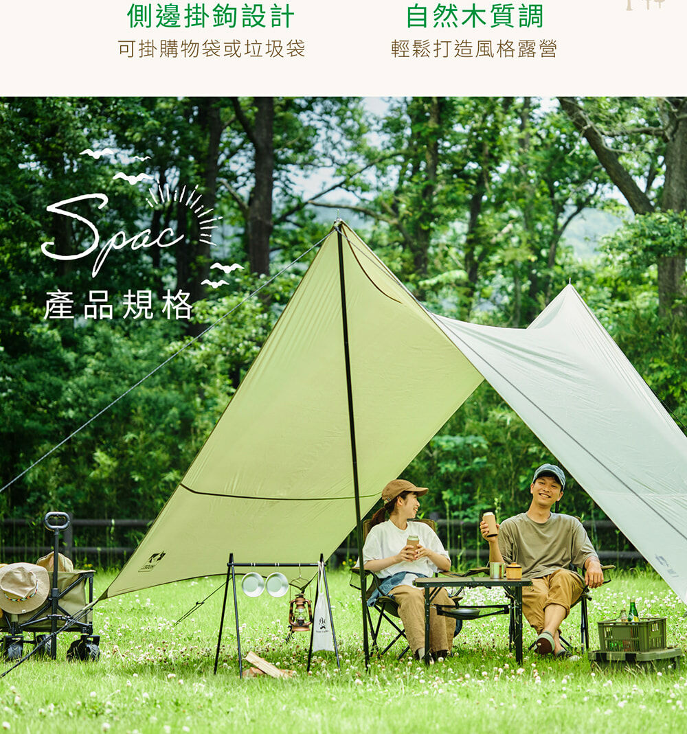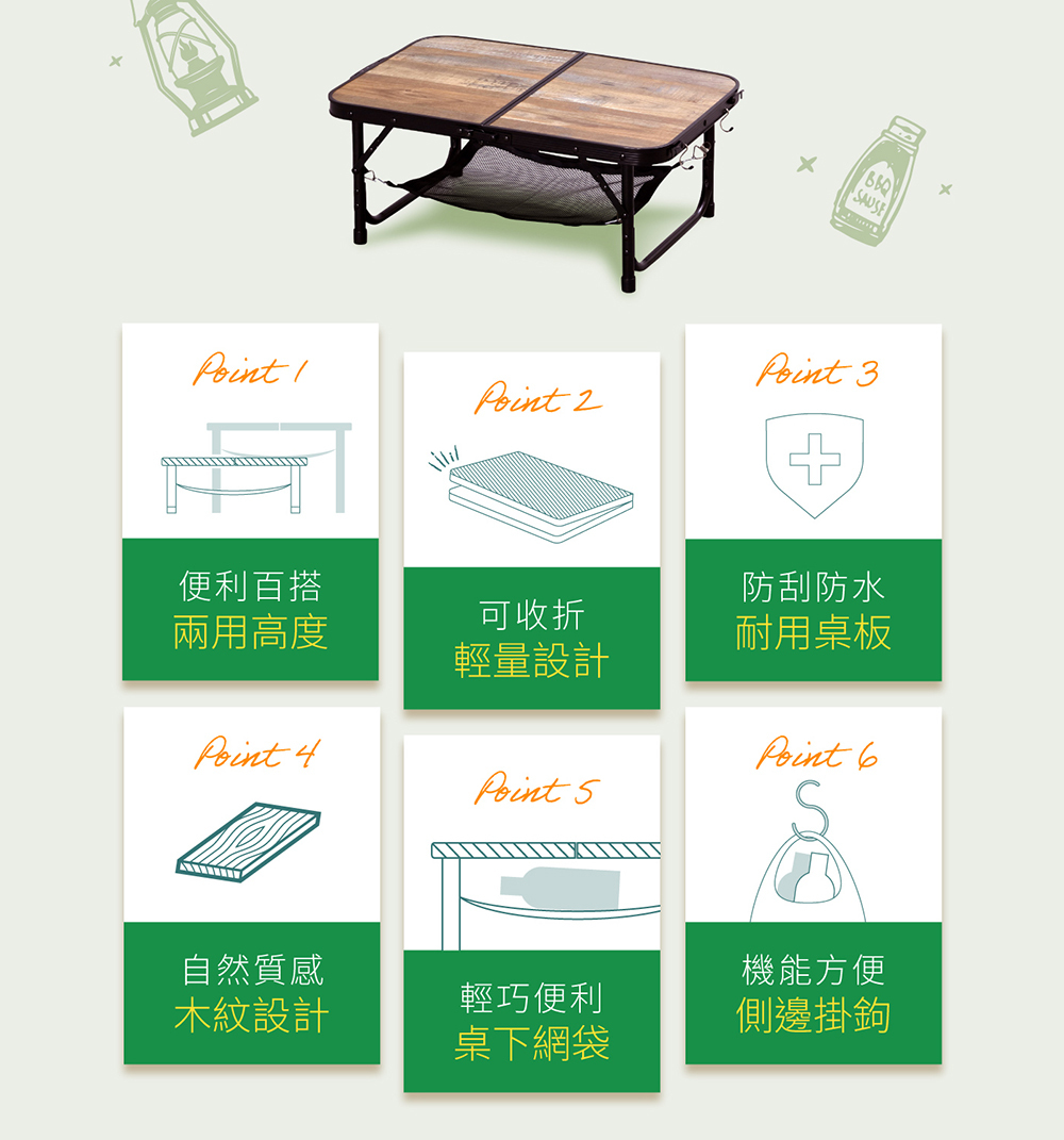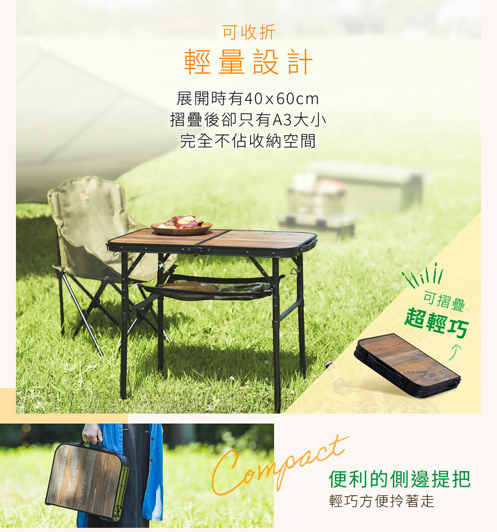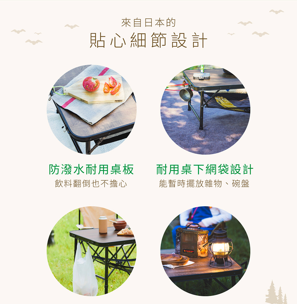 • 適合戶外的木質調設計,桌子高度可依需求調整24.5或53.5公分,各種戶外場合都能方便使用