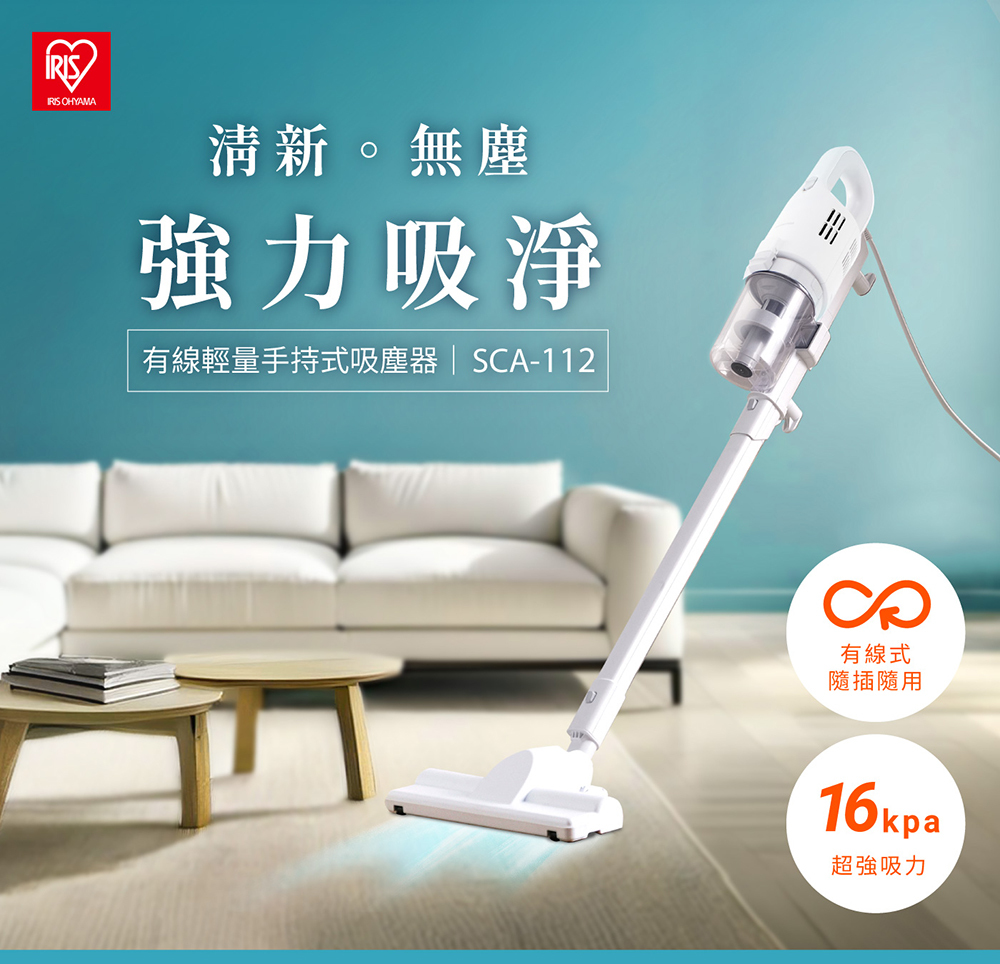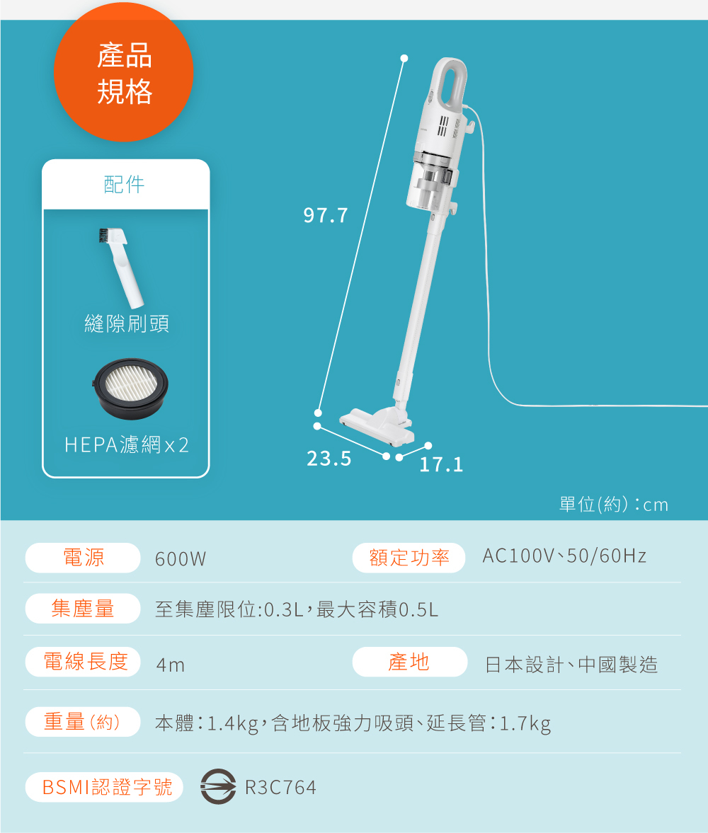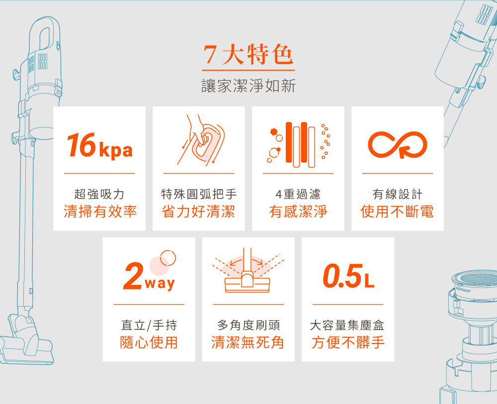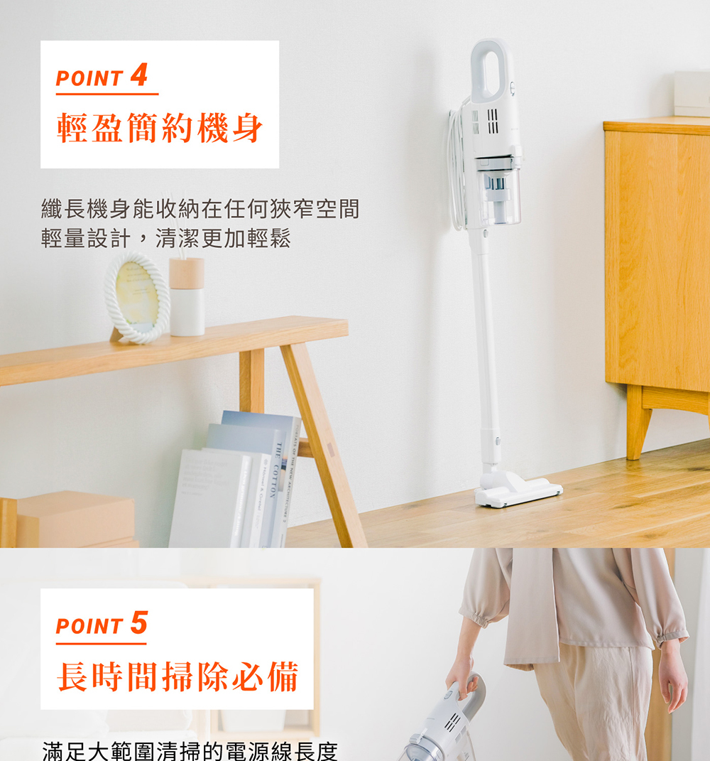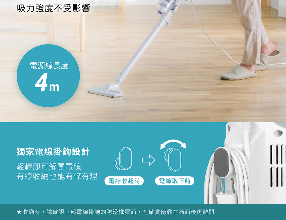• 有線設計讓使用時間變得無限制,吸力不減弱