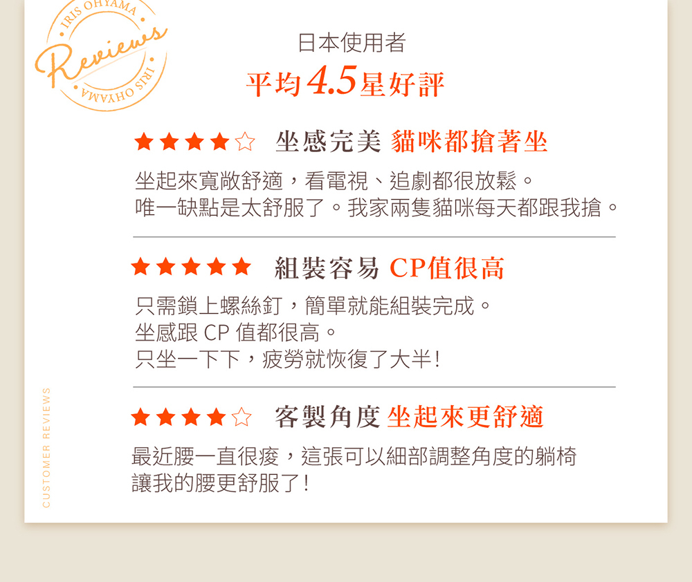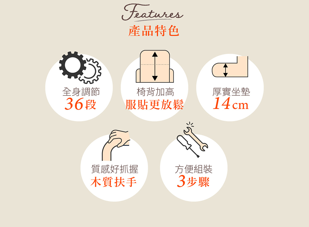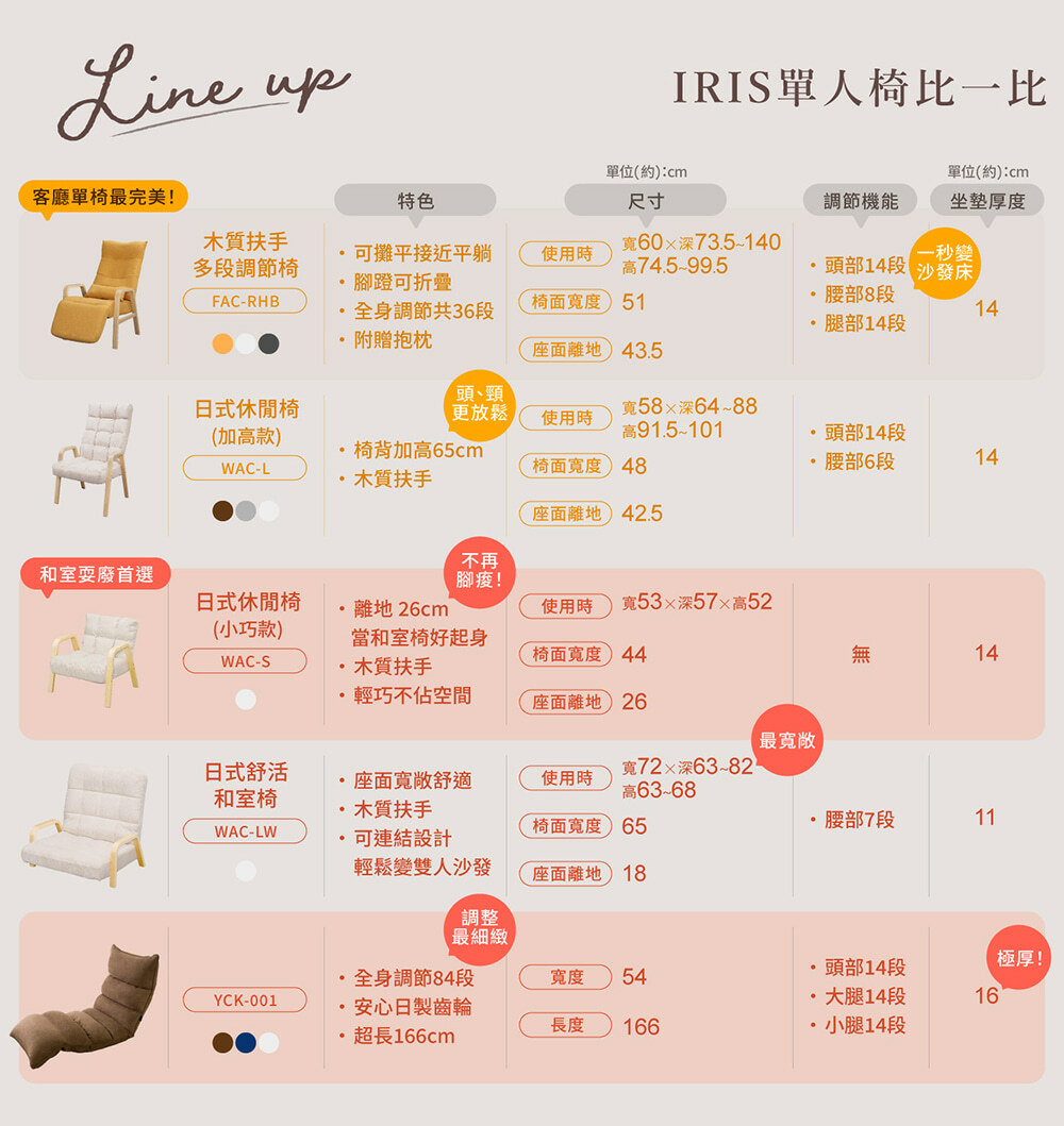 • 多段調節設計,頭部・腰部・腳部能個別調整