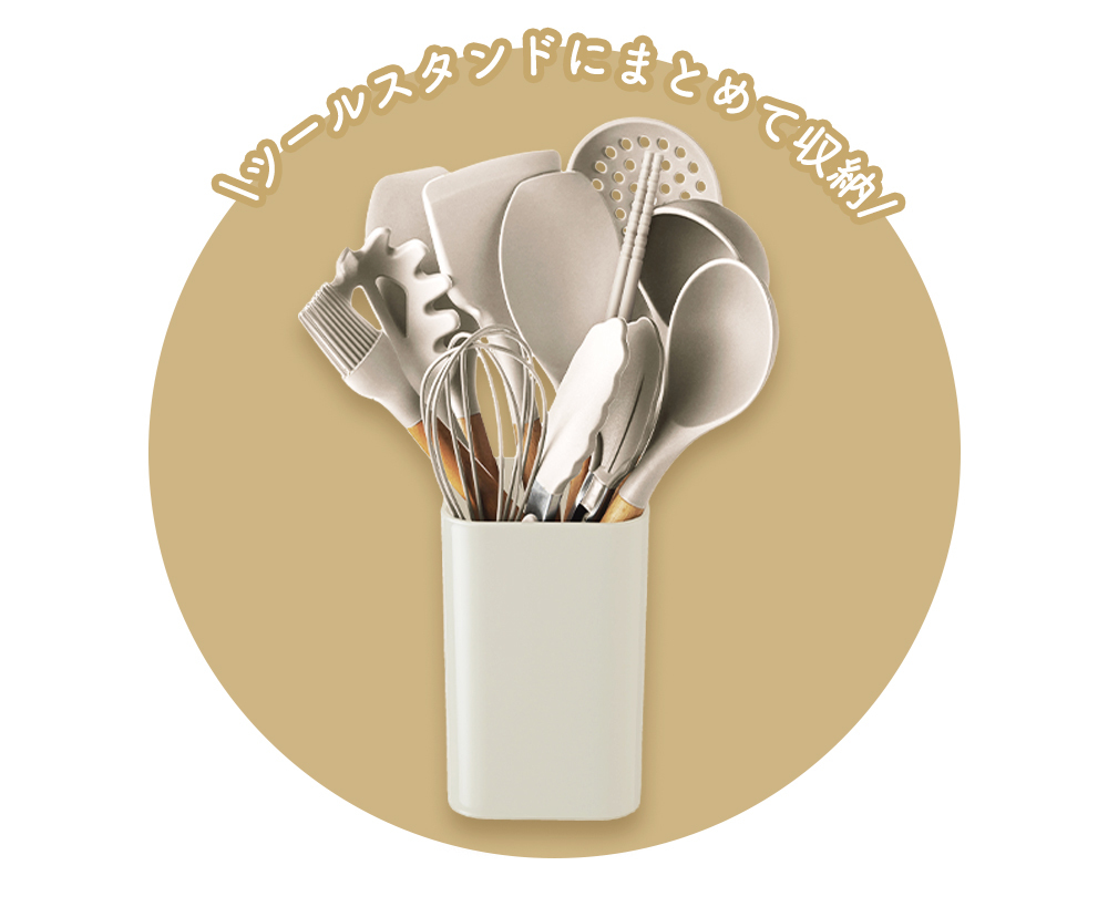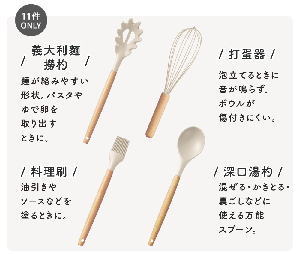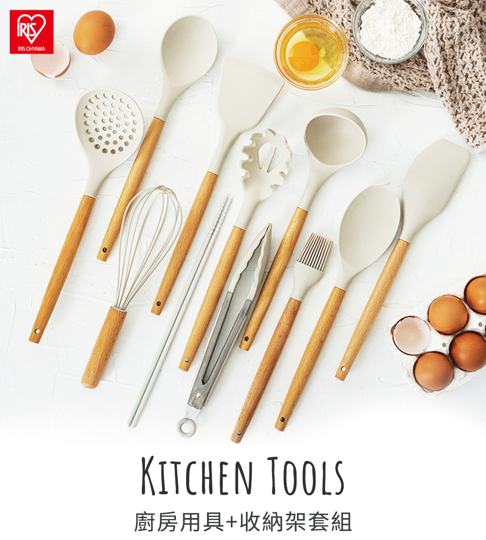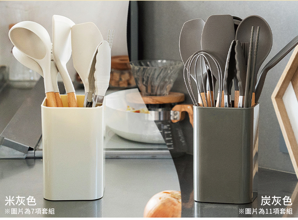 •組合內含:鍋鏟、湯匙、漏杓、淺口湯杓、深口湯杓、義大利麵撈杓、抹刀、筷子、食物夾、打蛋器、料理刷、用具收納架