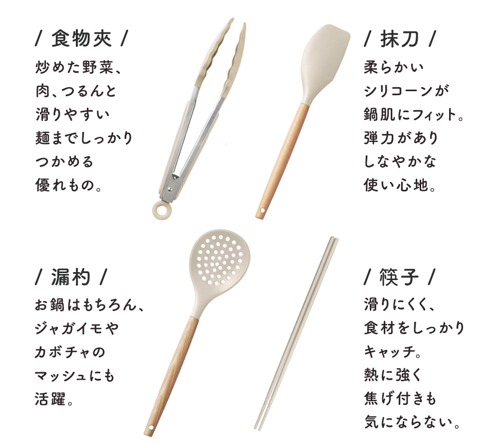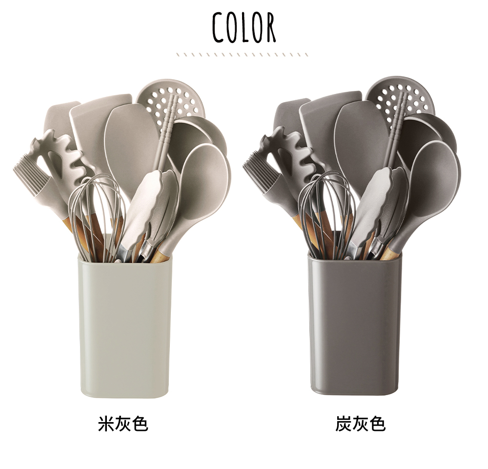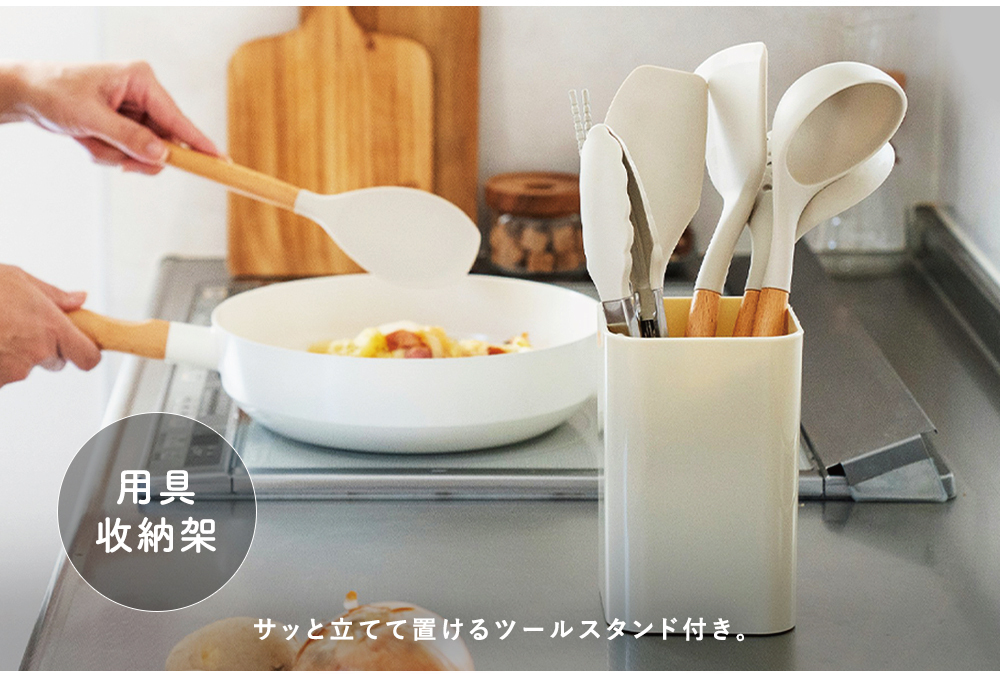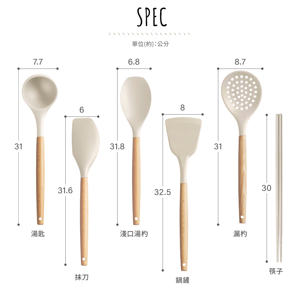 •組合內含:鍋鏟、湯匙、漏杓、淺口湯杓、深口湯杓、義大利麵撈杓、抹刀、筷子、食物夾、打蛋器、料理刷、用具收納架