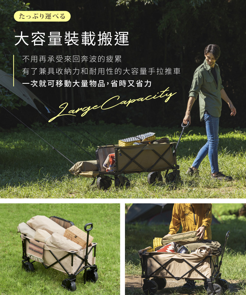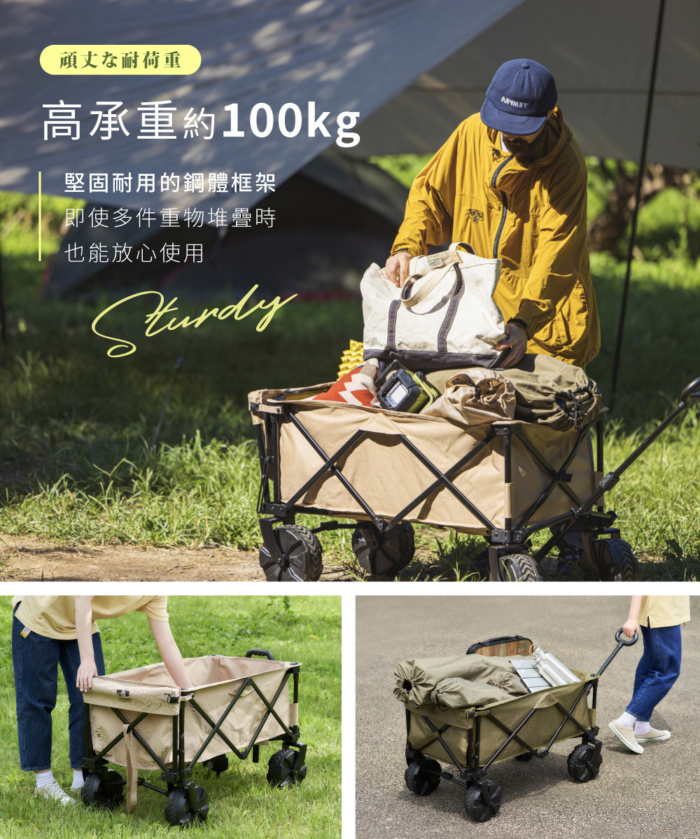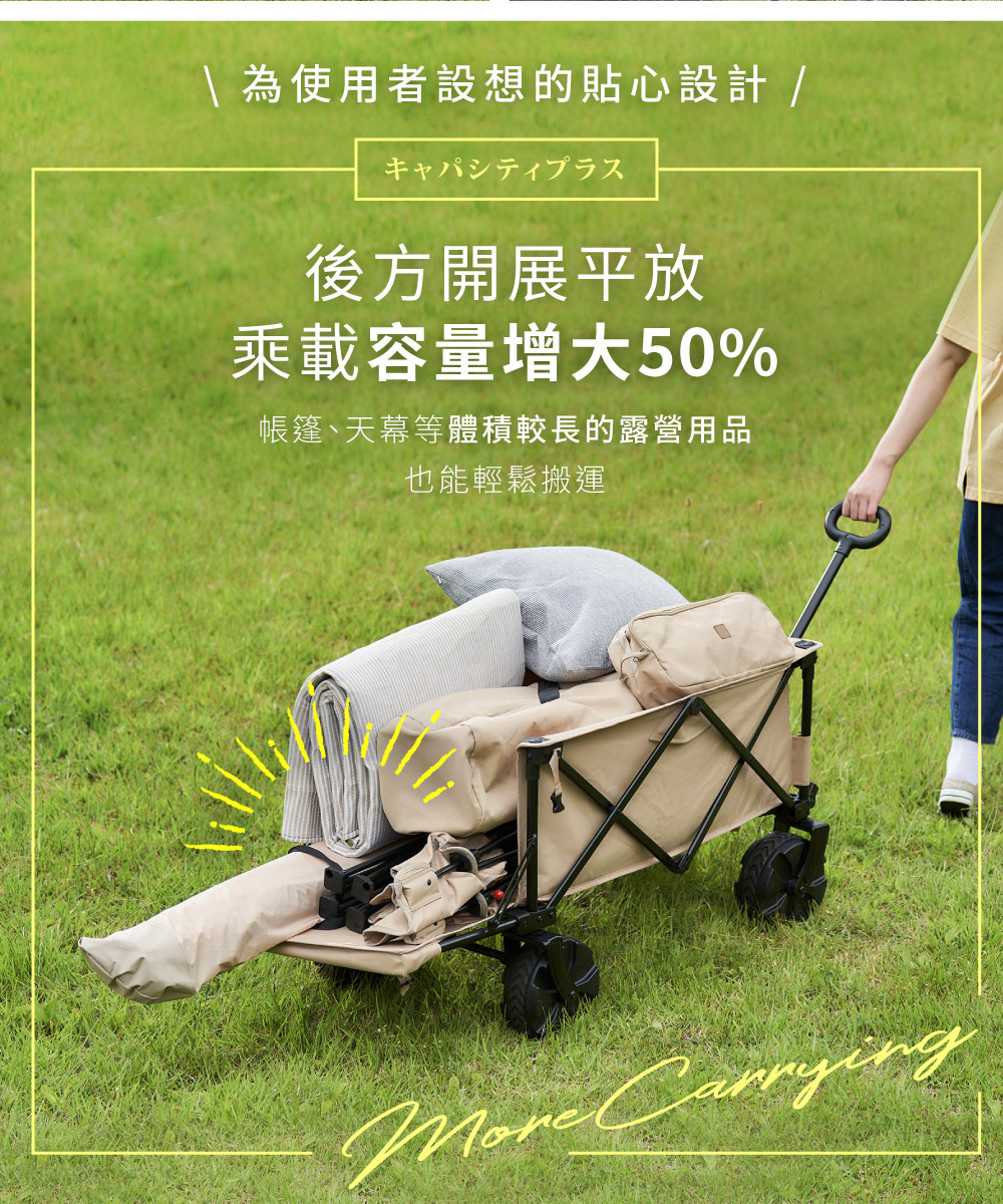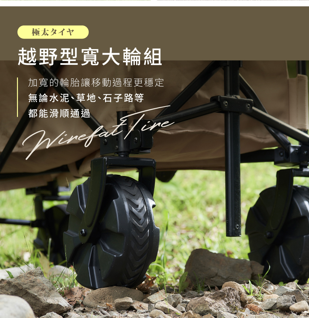 • 採用大輪組設計,凹凸不平的野營地也能安定操控